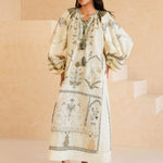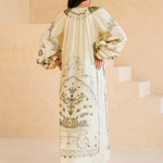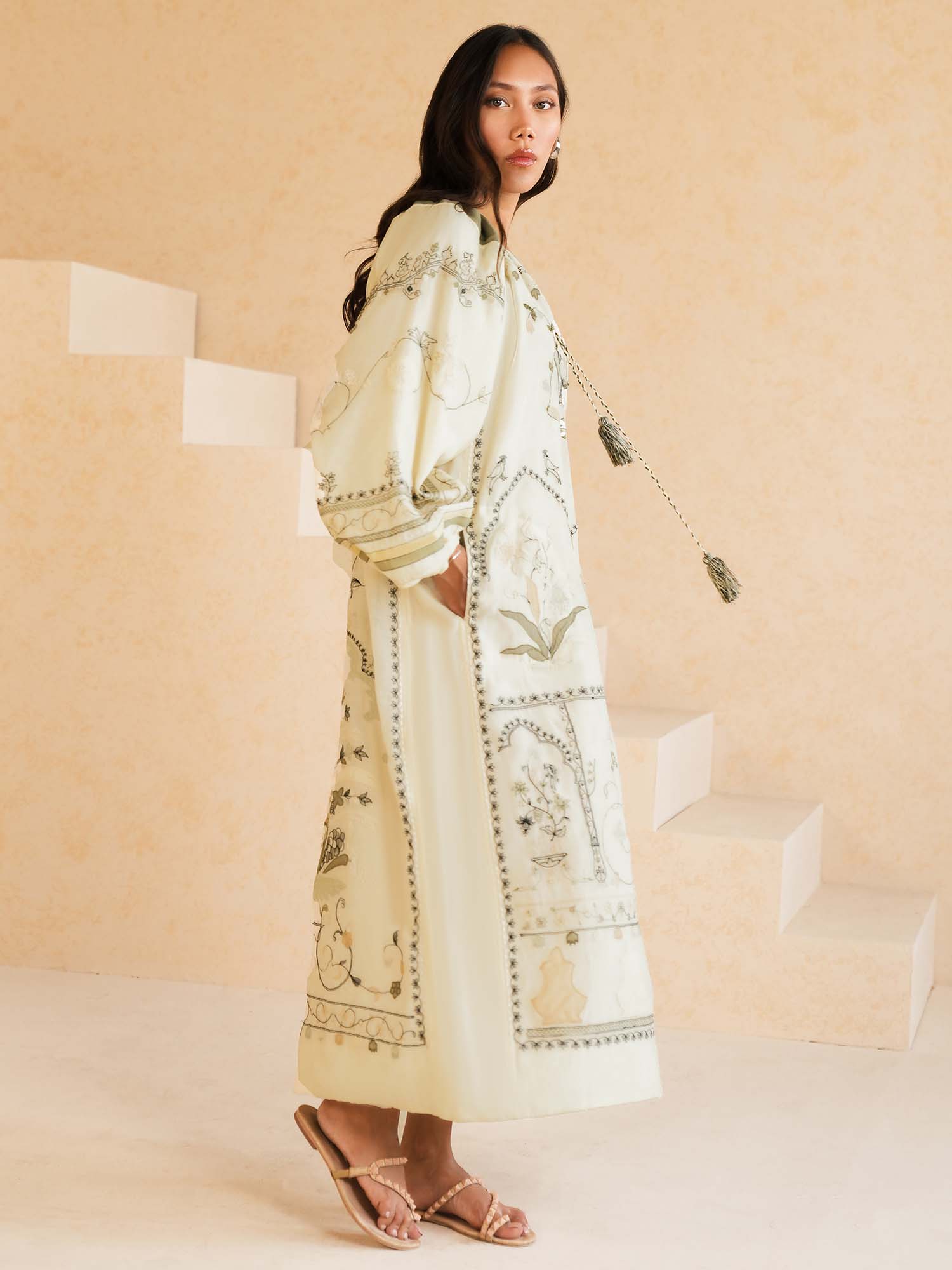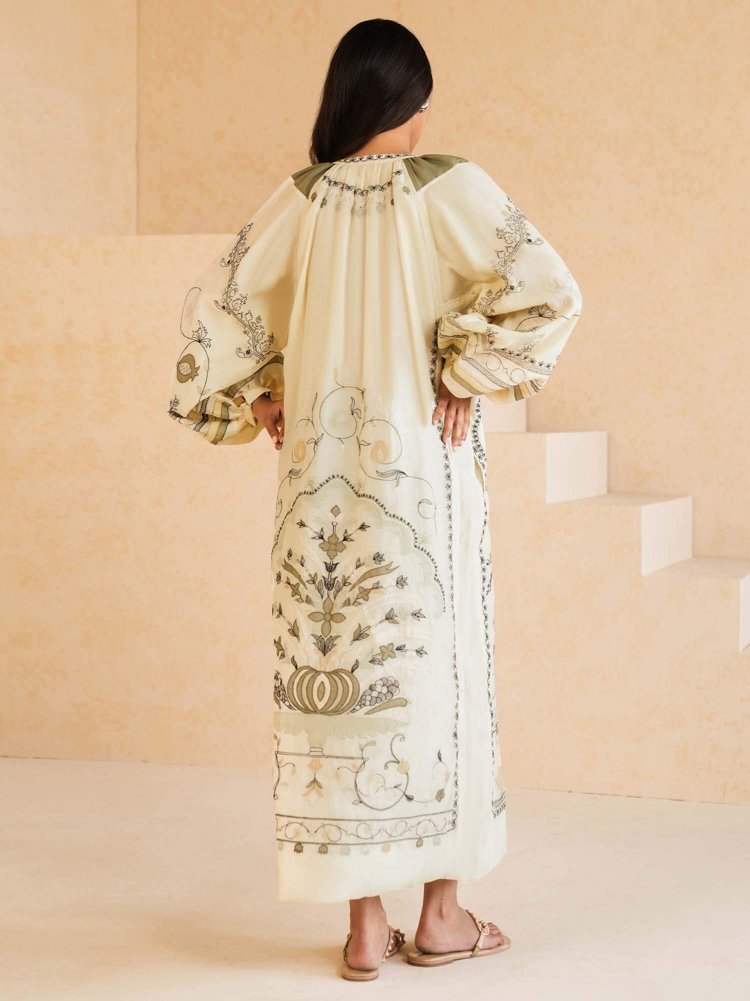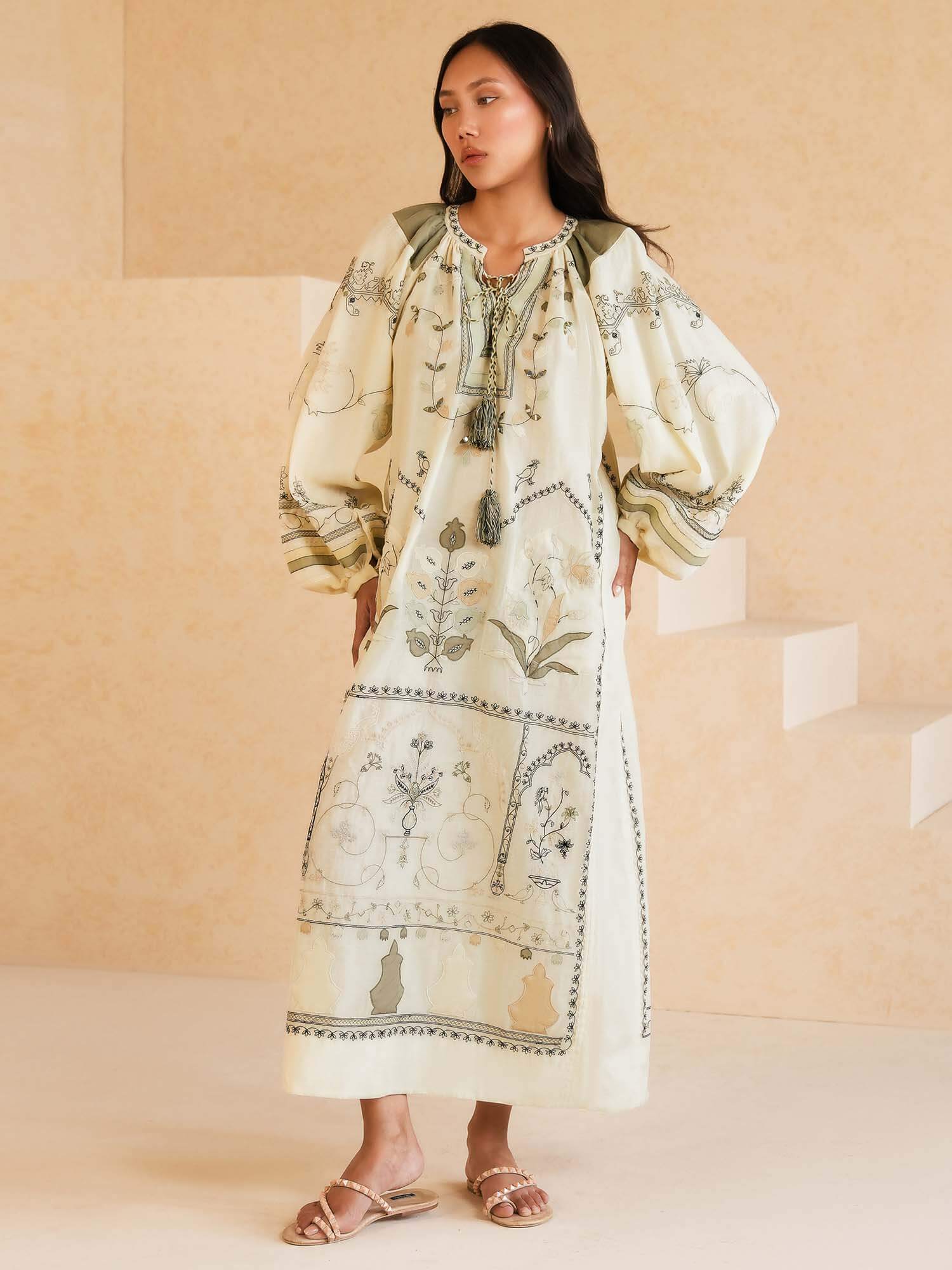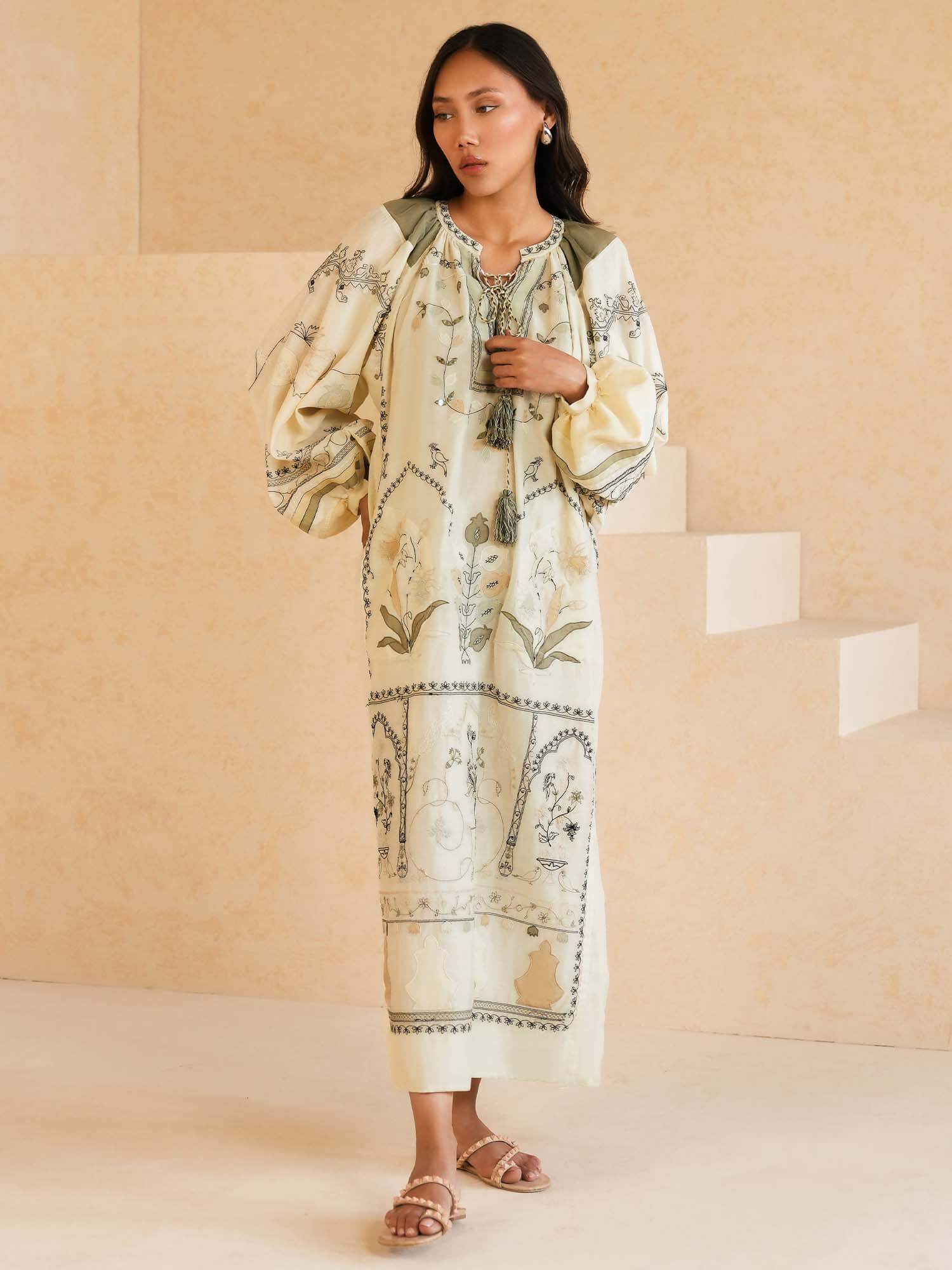 Buy now, love forever. Our ecru Anhar features fine aari embroidery with applique in tonal celadon, sage and black hues inspired by Mughal floral motifs. It is further elevated with hand crafted tassels. It can easily be dressed up or down for all your summer dalliances.