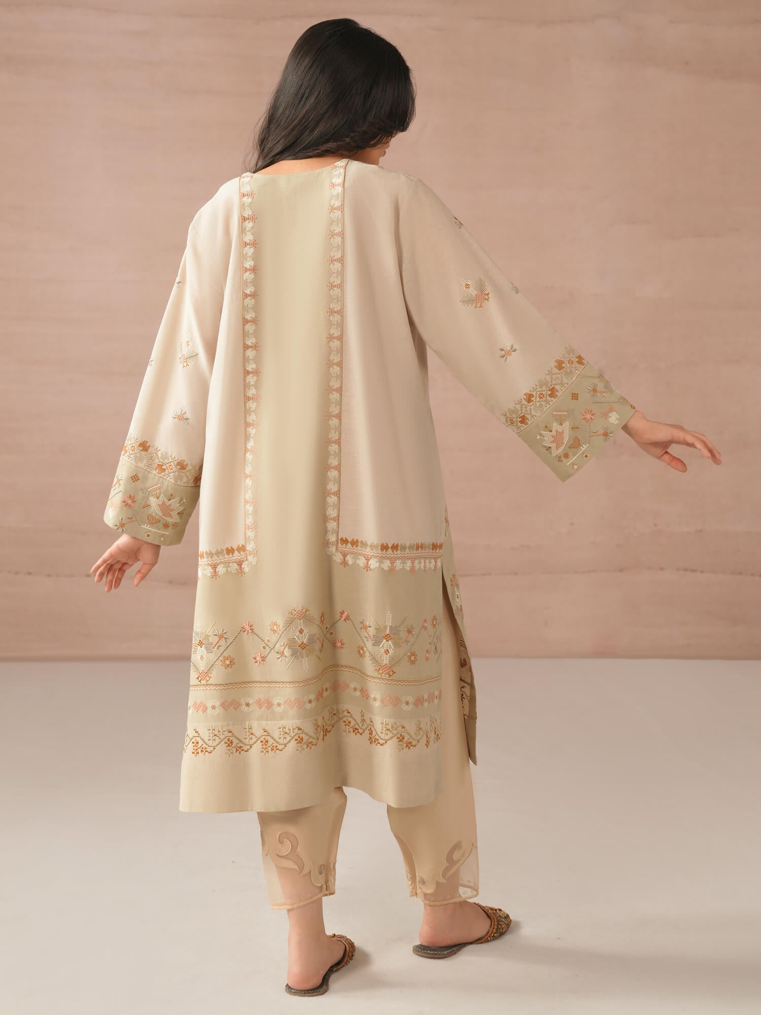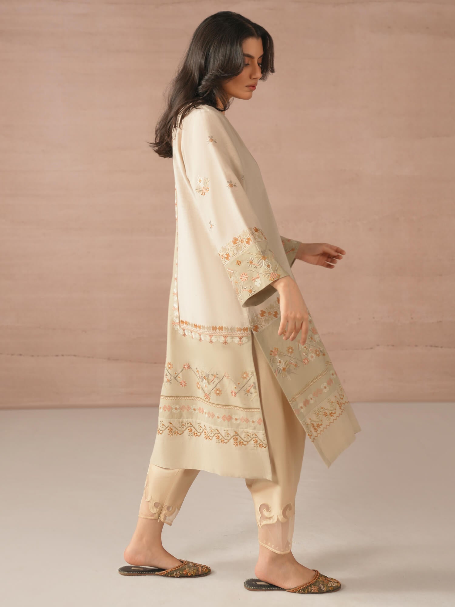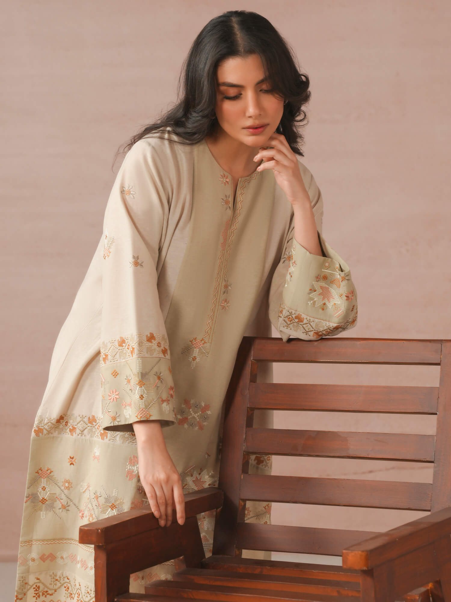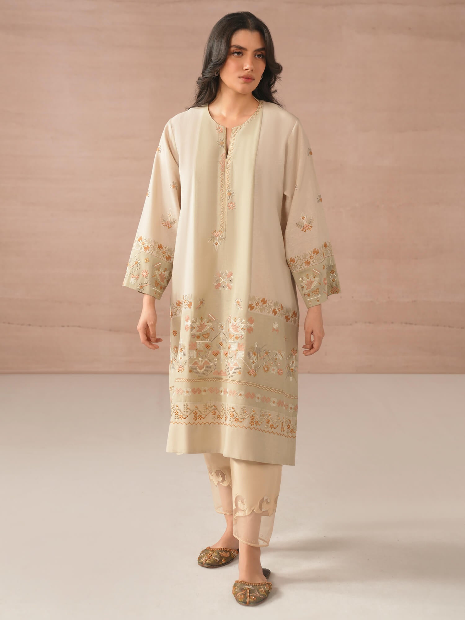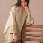 Cut from karandi, our Keenu kurta features tonal embroidery inspired by geometric motifs and is beautifully finished with crafted stitches. Perfect for your year-round wardrobe. Pair it with our sand skinny shalwar, as seen here.
