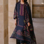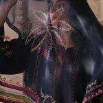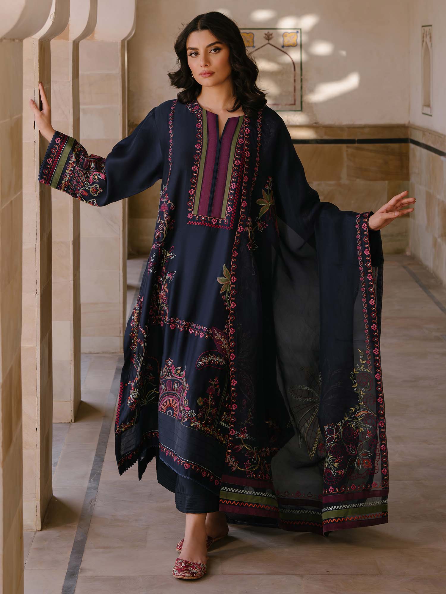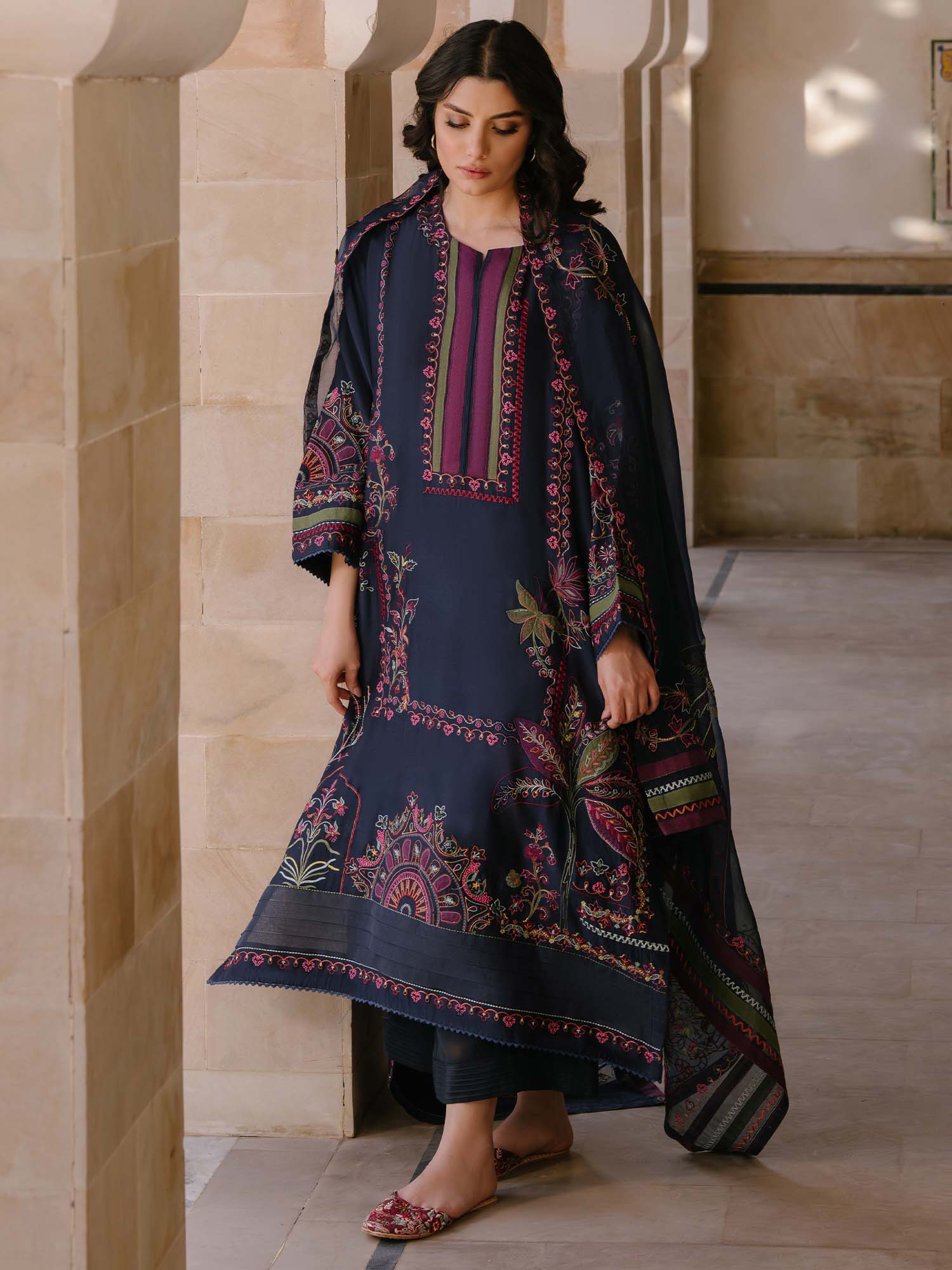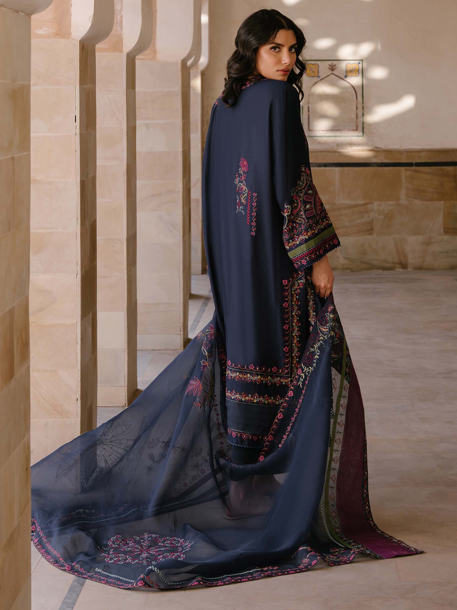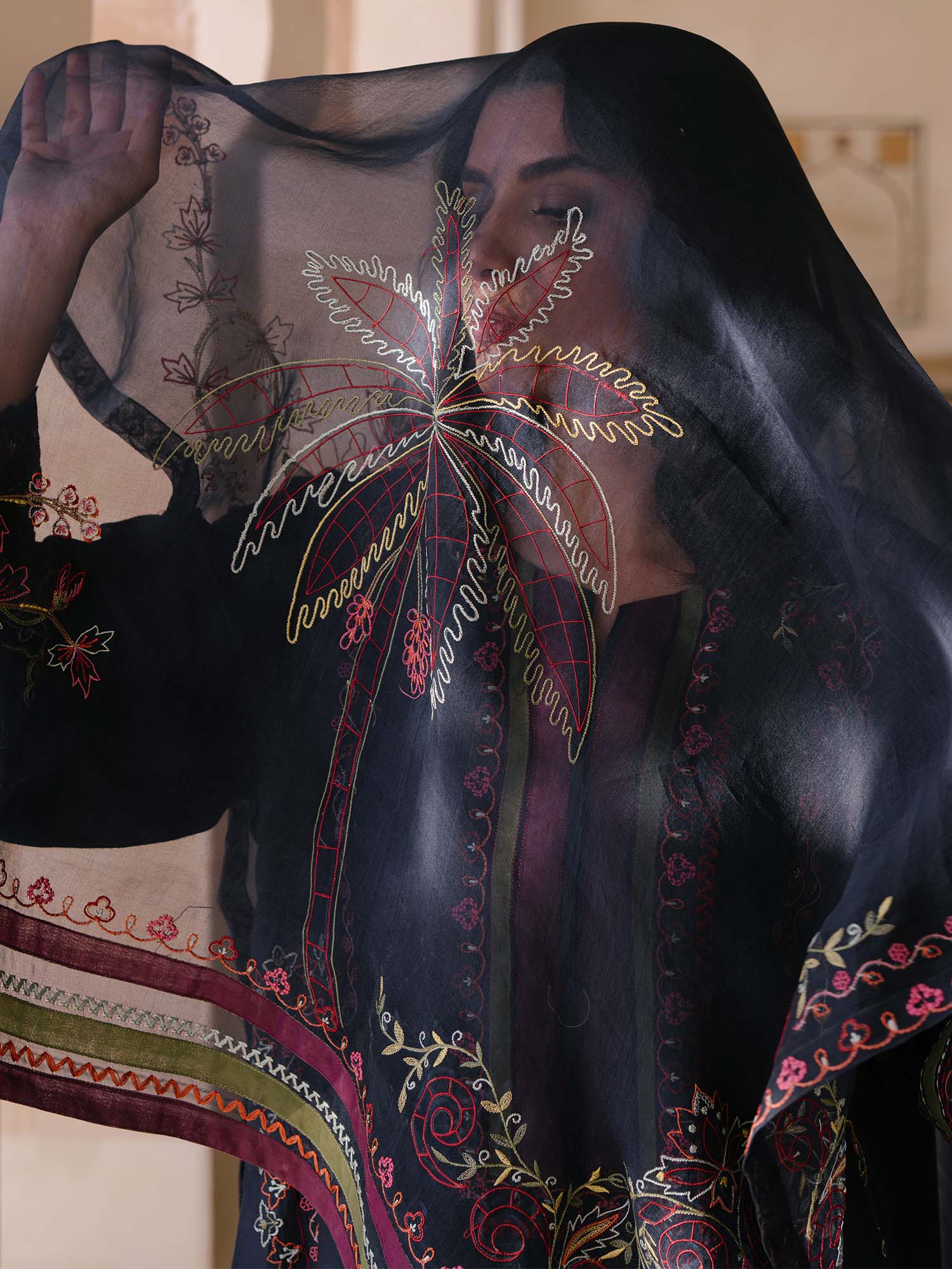 Inspired by Mughal florals and geometric motifs, our midnight blue Keenu kurta with a matching organza dupatta resonates festiveness. It features multi aari embroidery in complementing hues. Style yours with our blue izaar for a polished look.