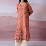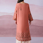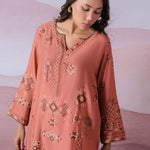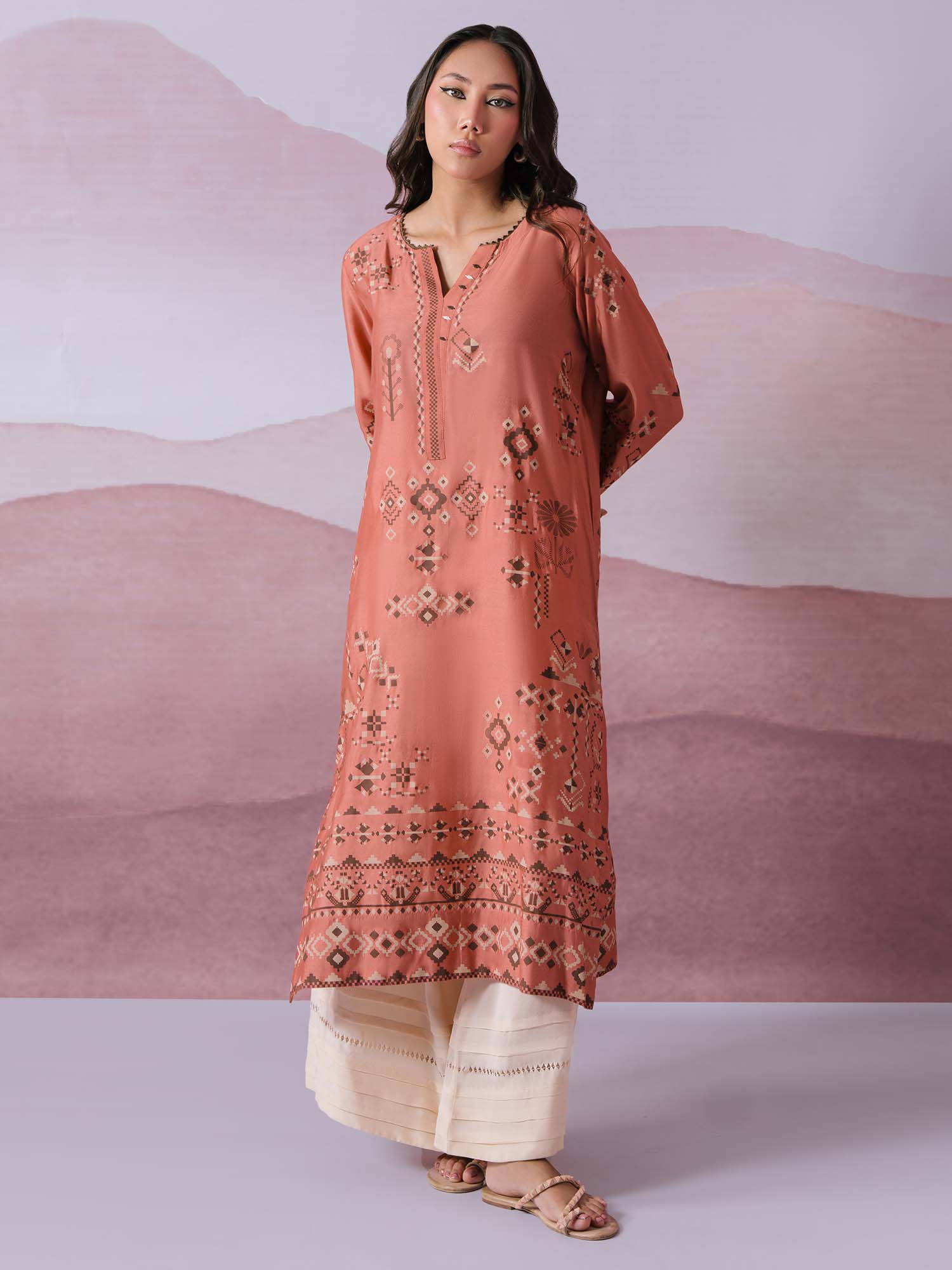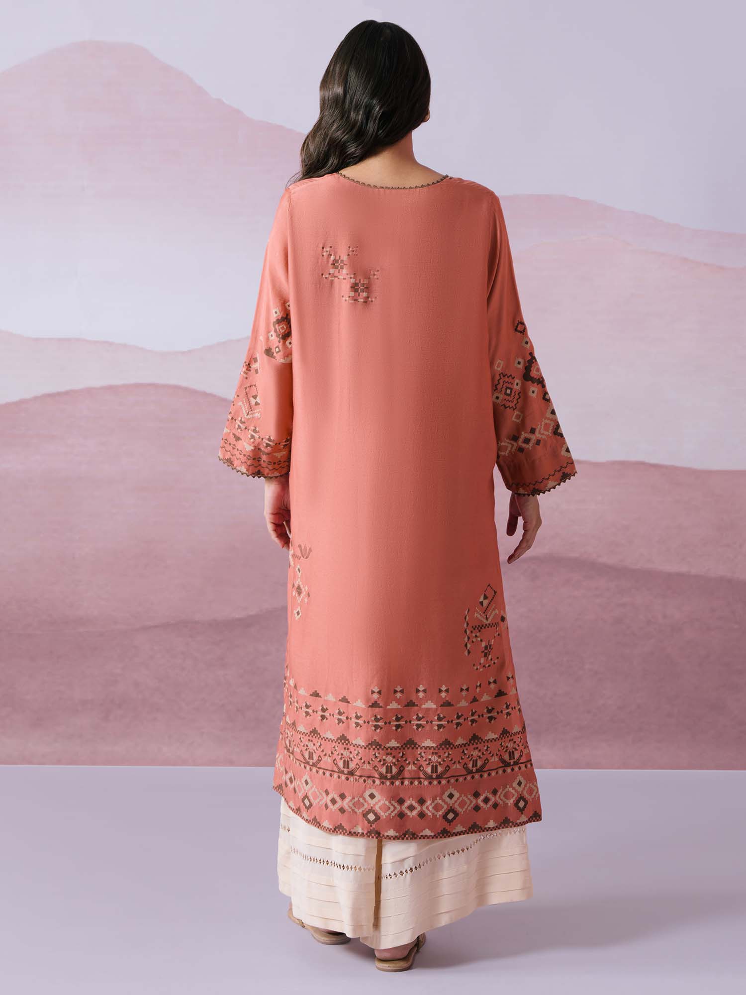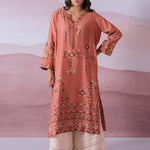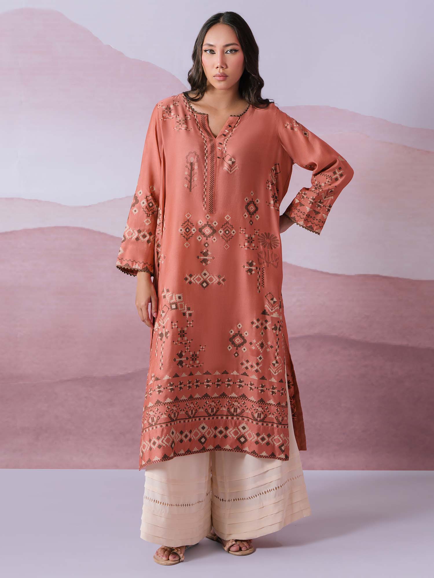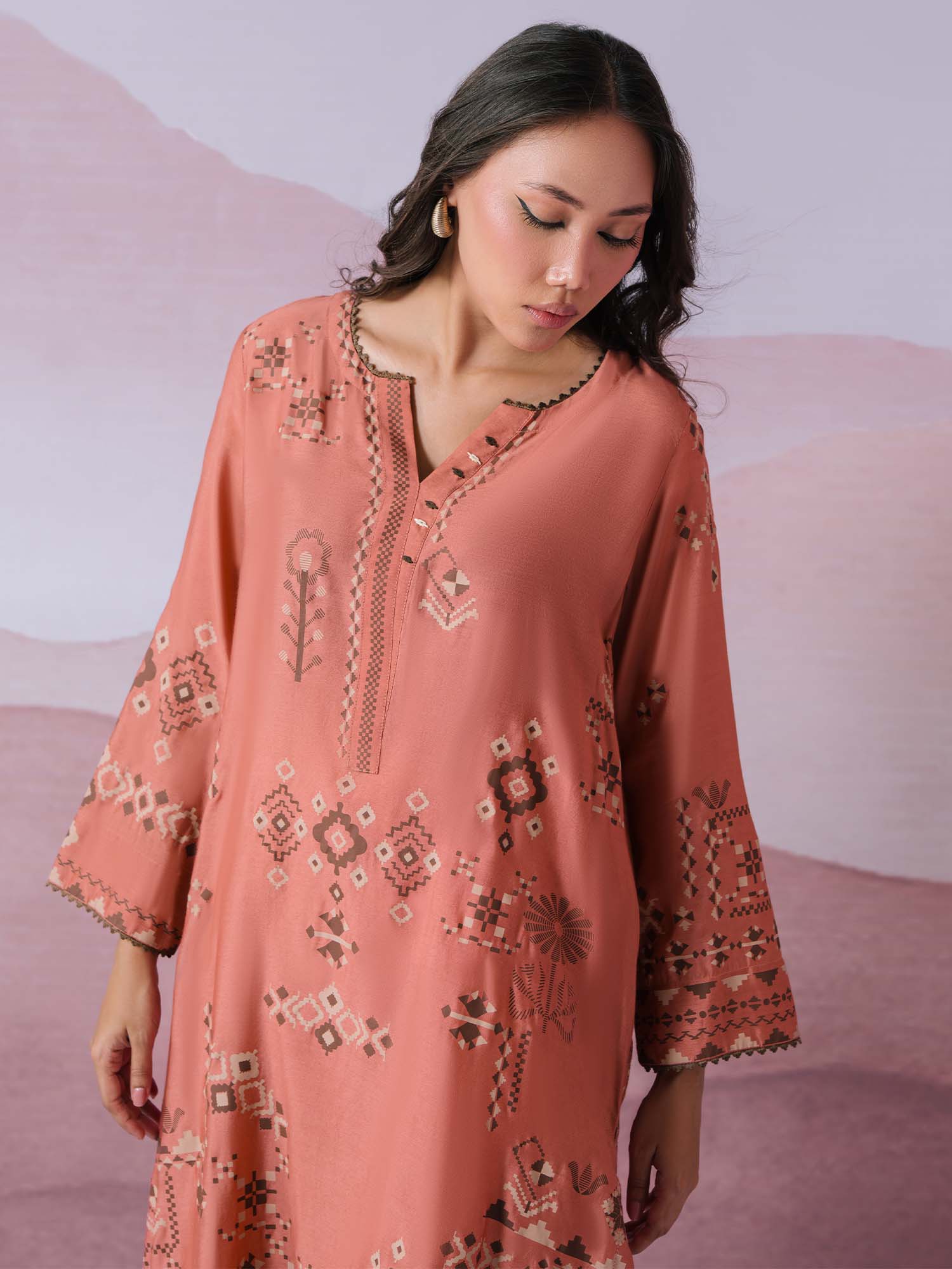 This throw-on-and-go salmon Malta kurta will be favourite addition to your wardrobe this season. It boasts an all over print in aztec and geometric motifs in complementary hues. Pair it with our crafted izaar, as seen here.