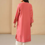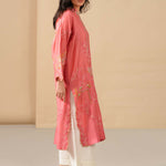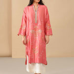 The geranium pink Raya kurta can be easily dressed up or down for all your winter dalliances. Inspired by suzani and Mughal floral motifs, it showcases fine multi hued resham embroidery with applique accents. Pair with ivory izaar for a complete look.