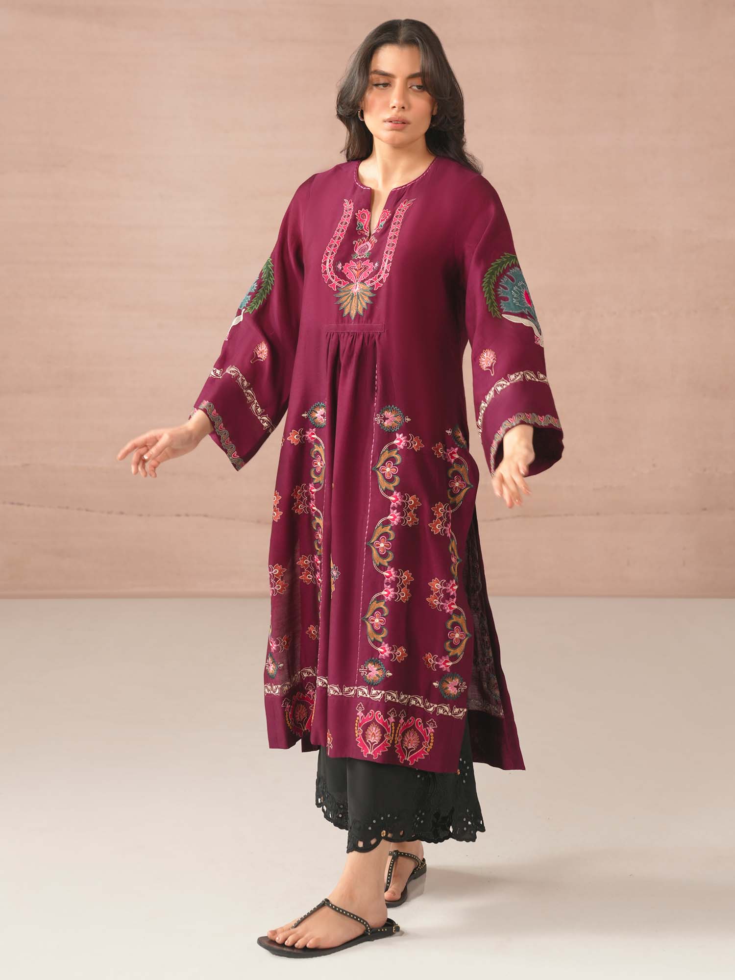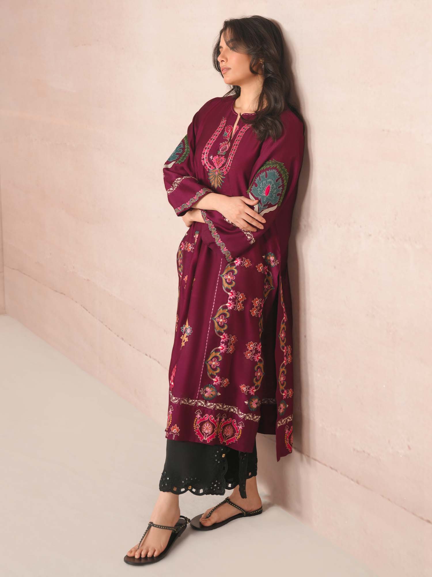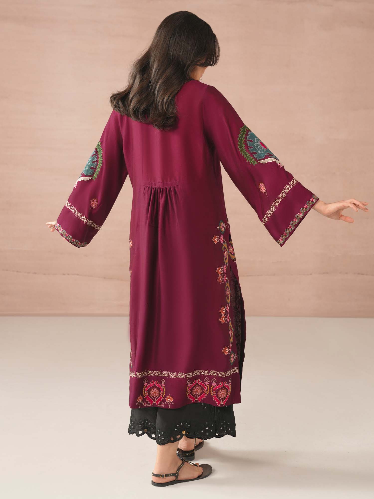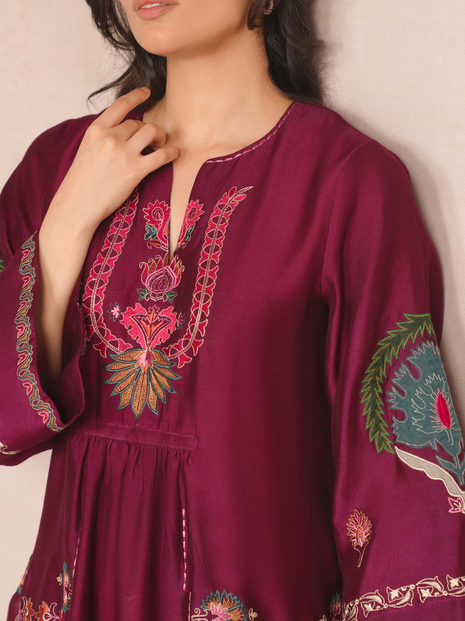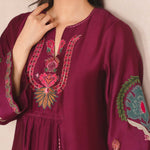 Crafted from cotton silk, our magenta purple Samara features fine multi aari embroidery with applique accents in complementing hues inspired by suzani and Uzbeki motifs. Style it with our black crafted izaar for an elevated look at any time of the day.