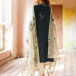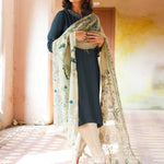 Our skinny Malta kurta in teal is a must-have for summer occasions. It features single aari embroidery with applique in complementing hues and is elevated with cutowrk on the sleeves. It is teemed with a moss green embroidered organza dupatta. Pair it with our crafted skinny shalwar for a complete look.