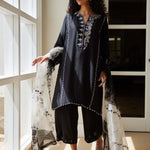 Cut from cotton silk, our Raya kurta features fine embroidery with zardozi work inspired by French floral motifs. It is paired with a matching izaar and a colour-blocked organza dupatta for an effortless look.