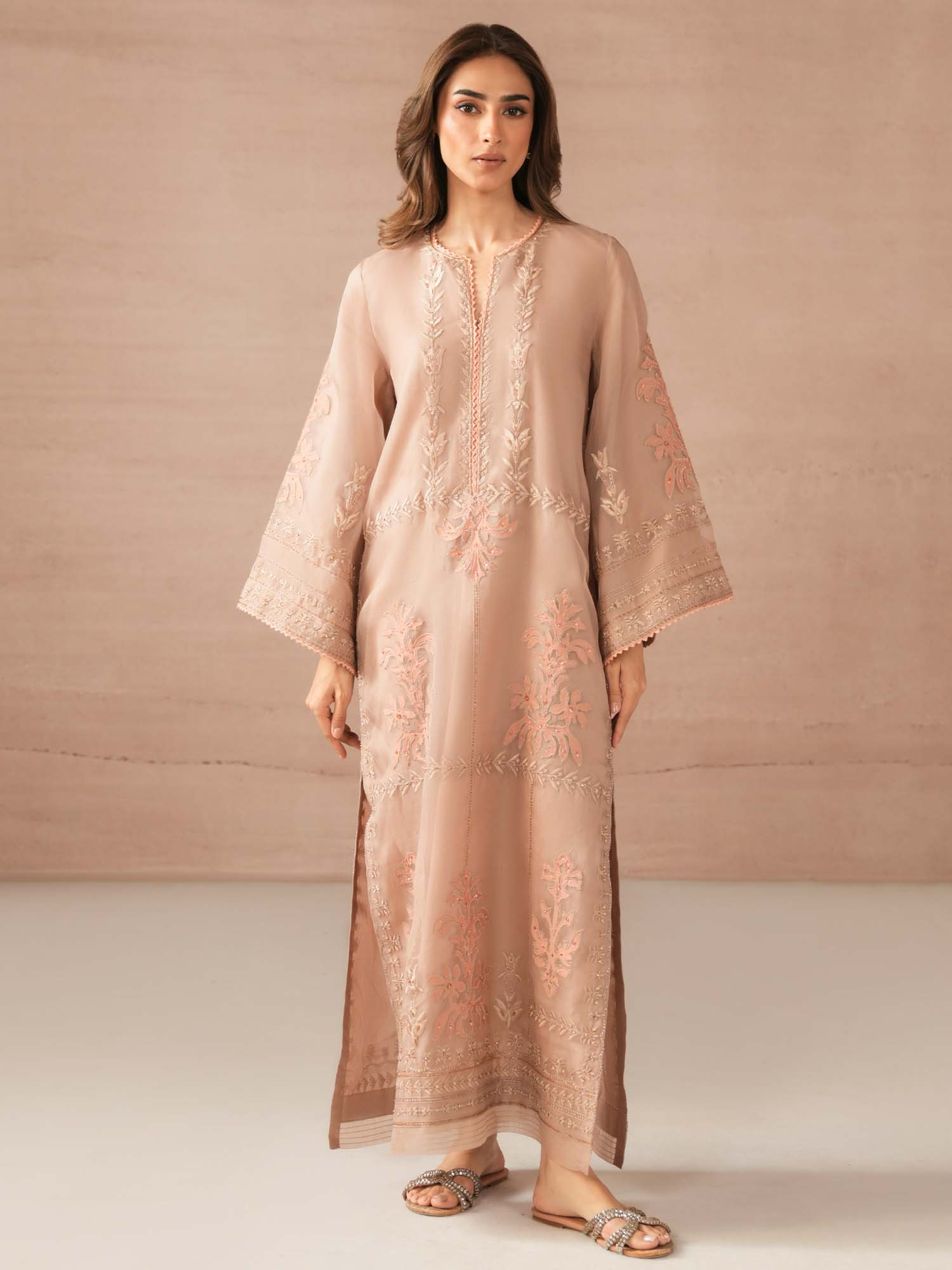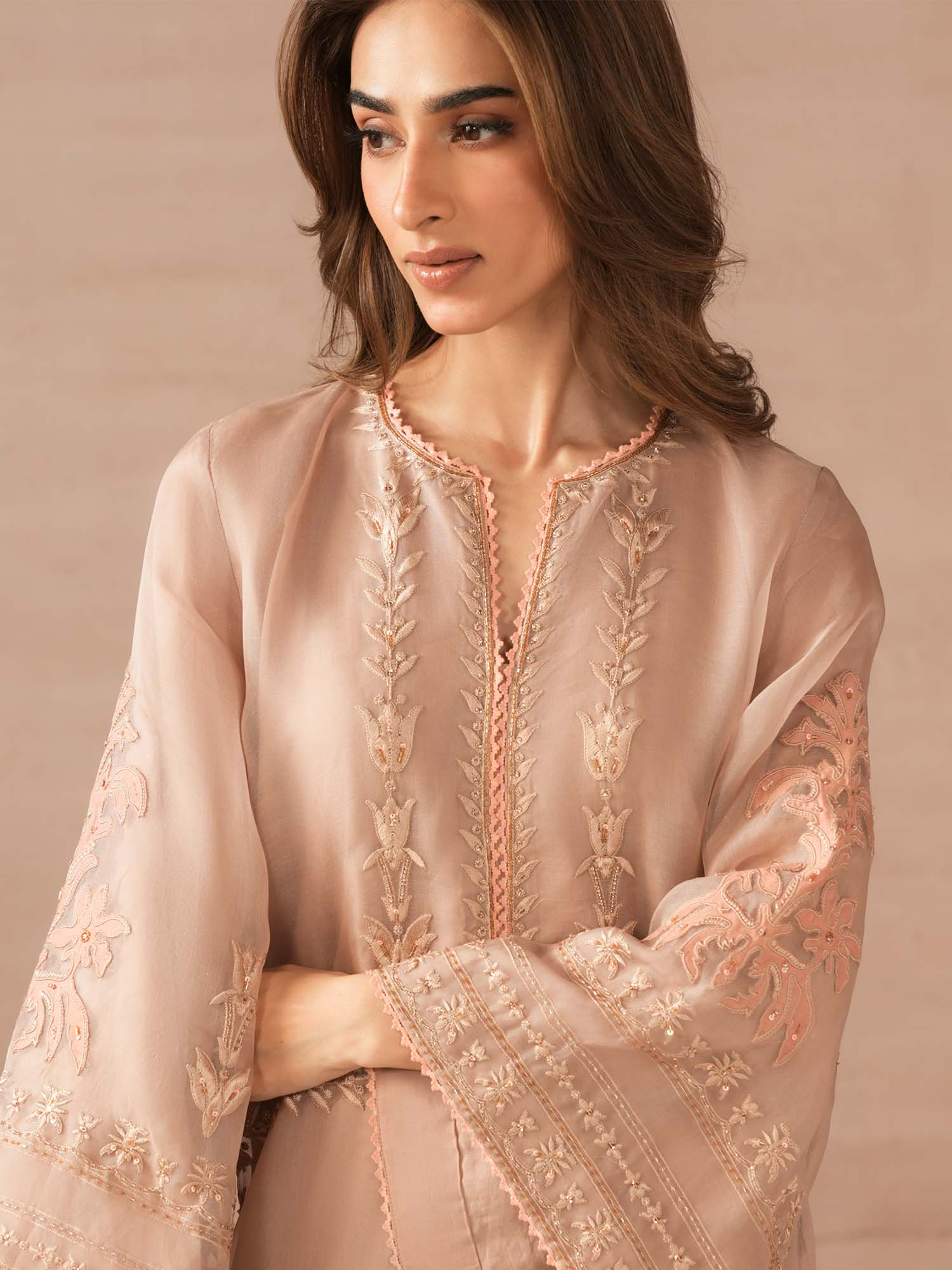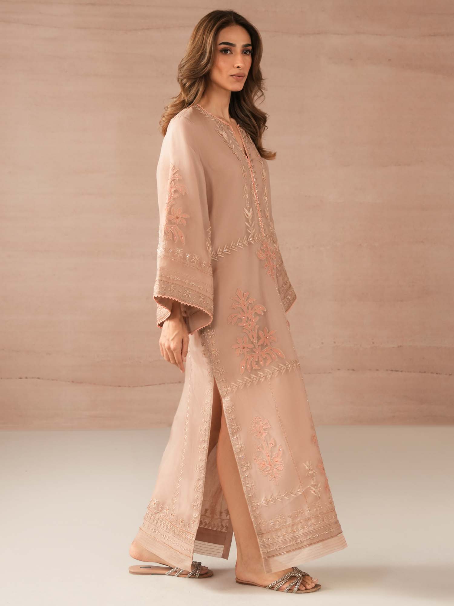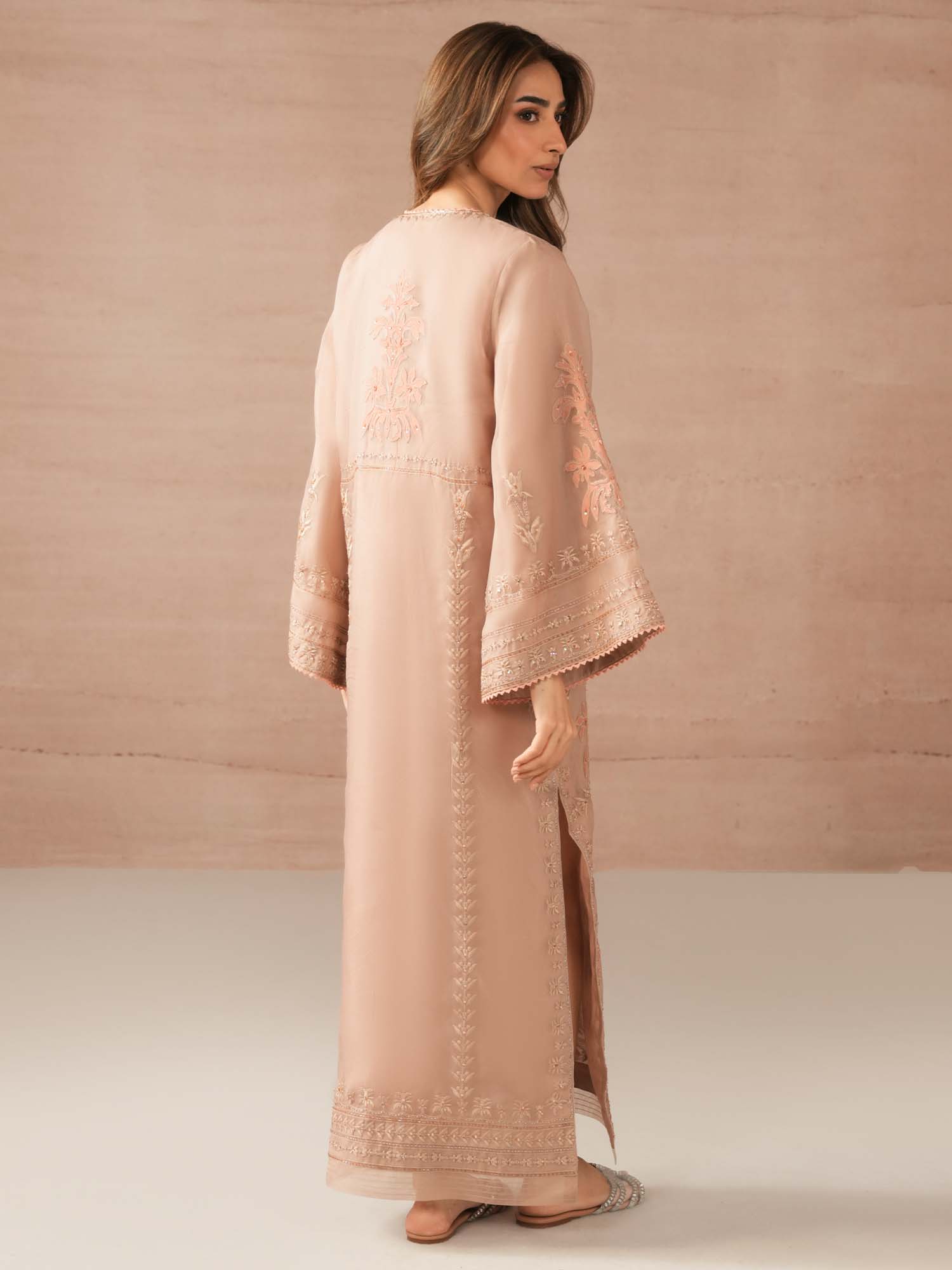 Our opal pink Savannah showcases self on self applique with jewelled work in complementing hues inspired by Persian floral motifs. Perfect for moonlit occasions, this is the perfect addition to your festive wardrobe.
