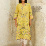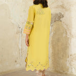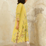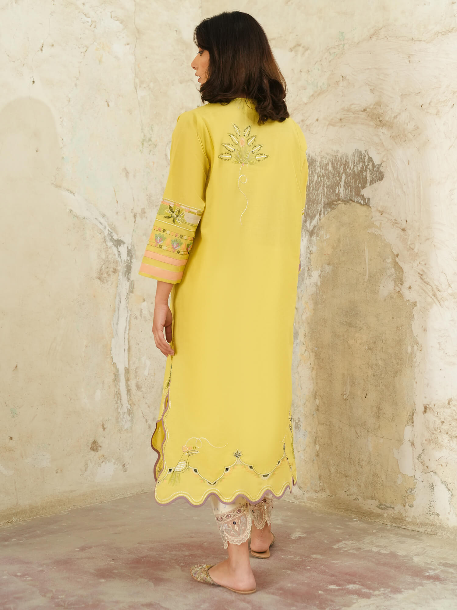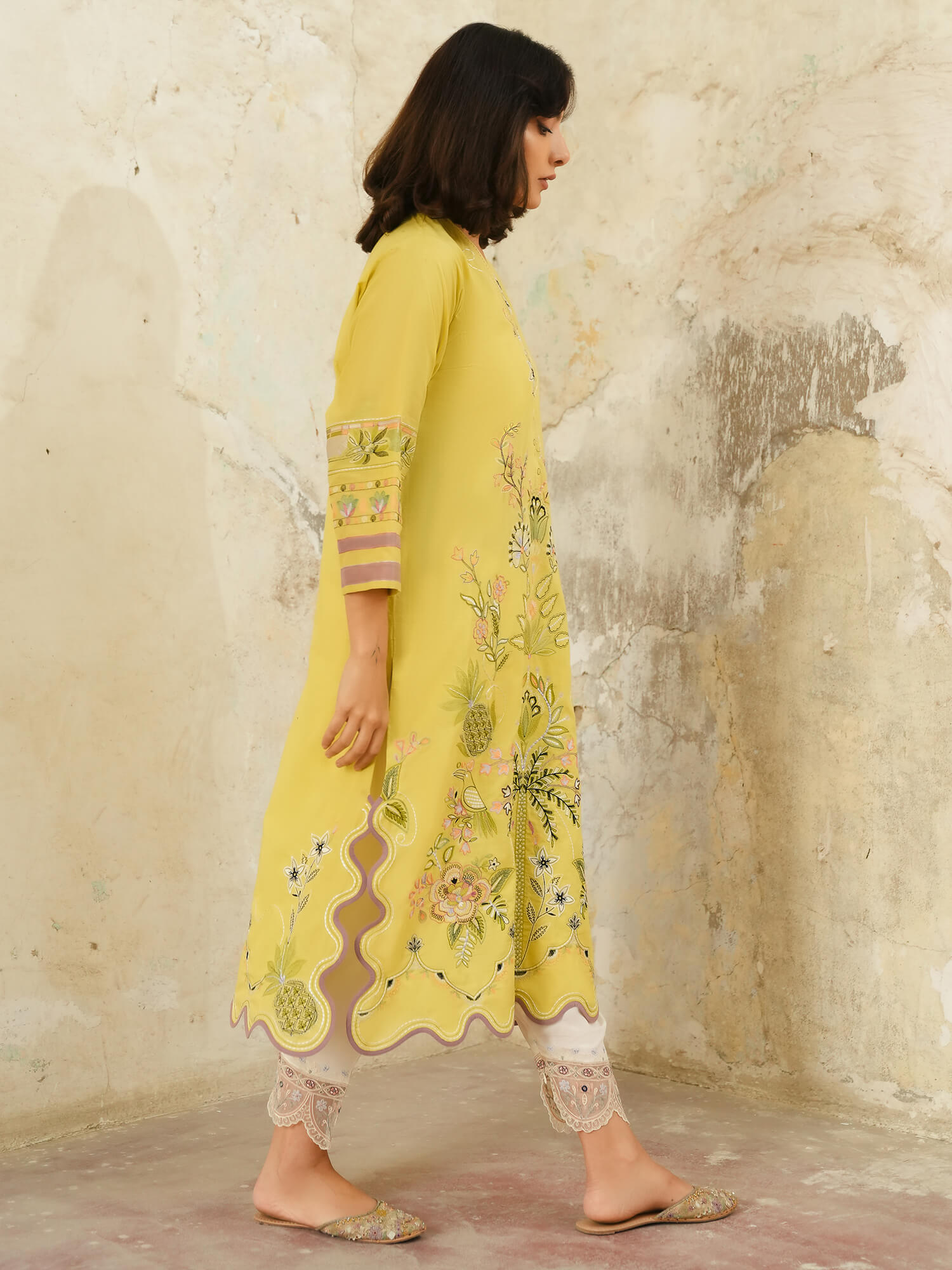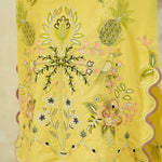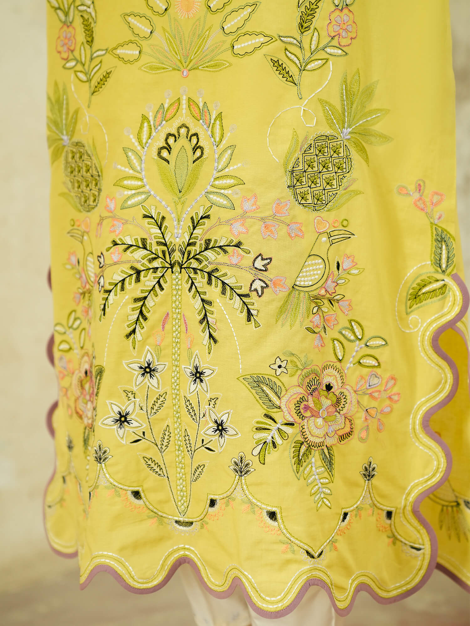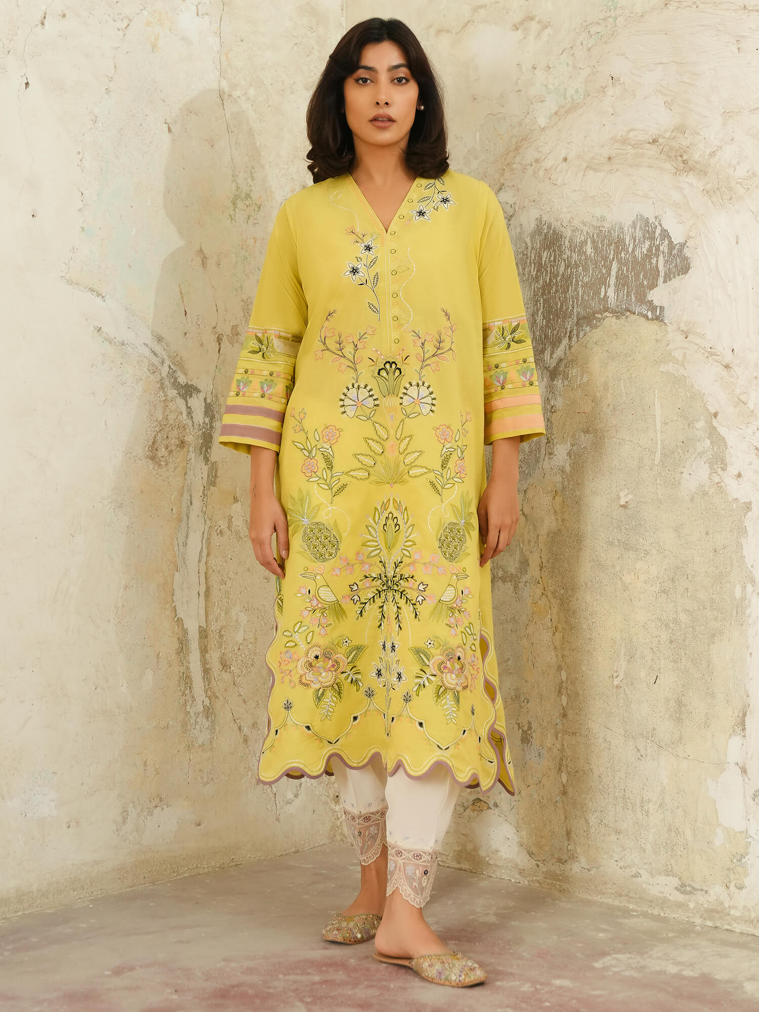This pale chartreuse Raya kurta features multi-hued resham embroidery all over in pastel hues inspired by the beauty of tropical flora and fauna motifs. Pair it with our crafted skinny shalwar for an elevated look for anytime of the day.