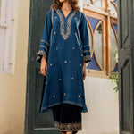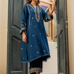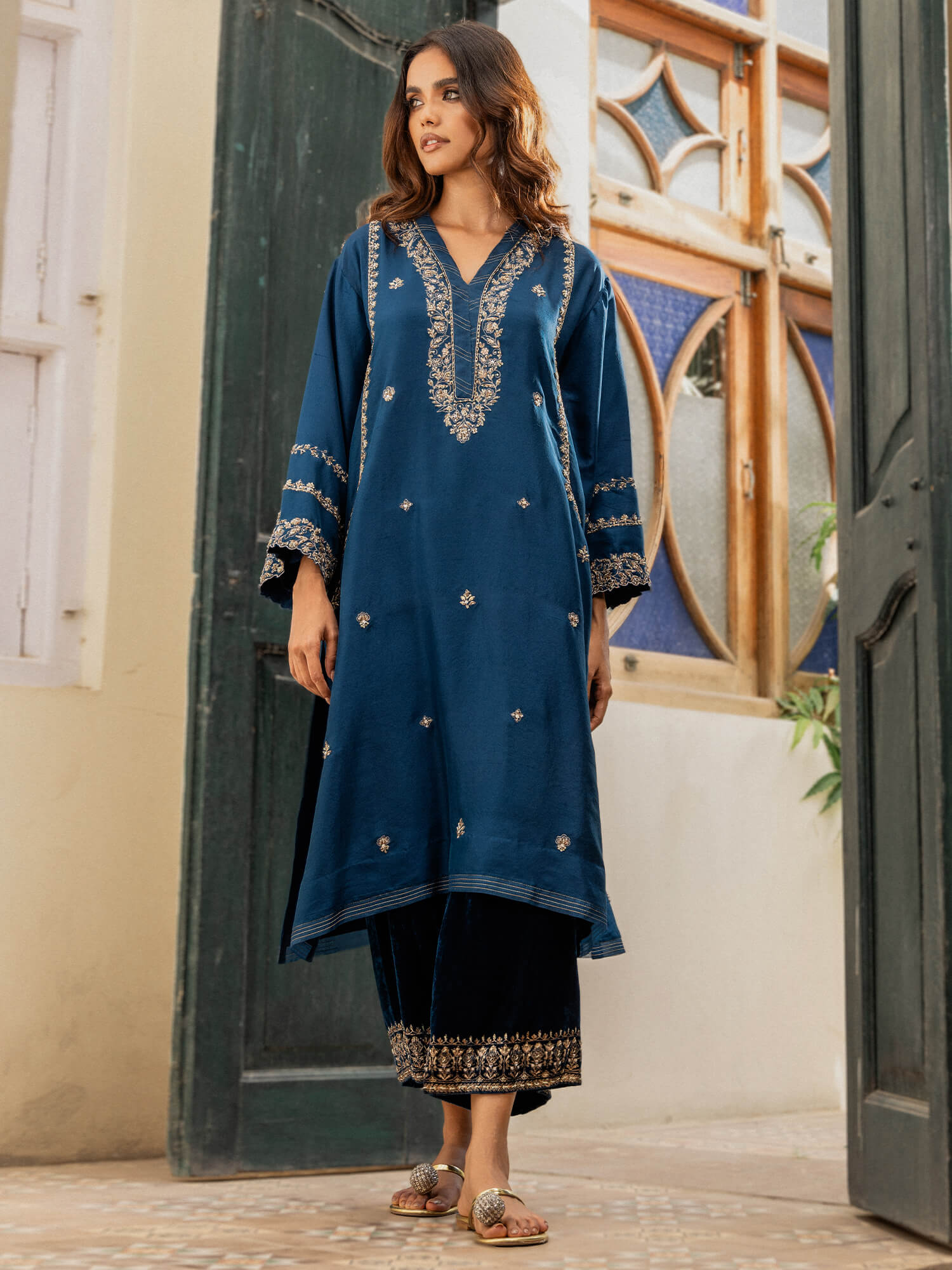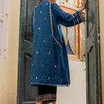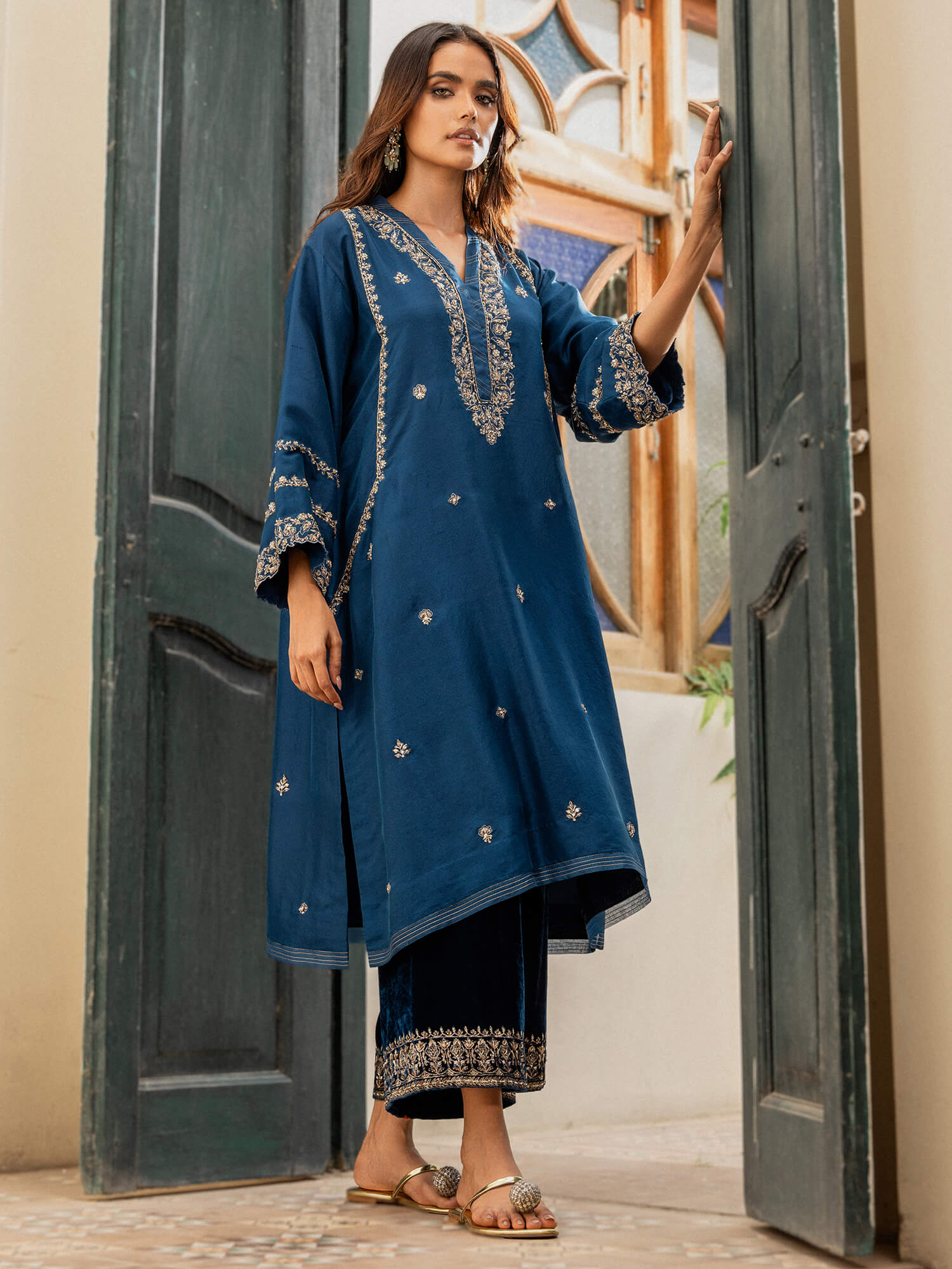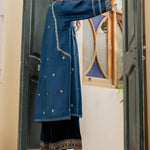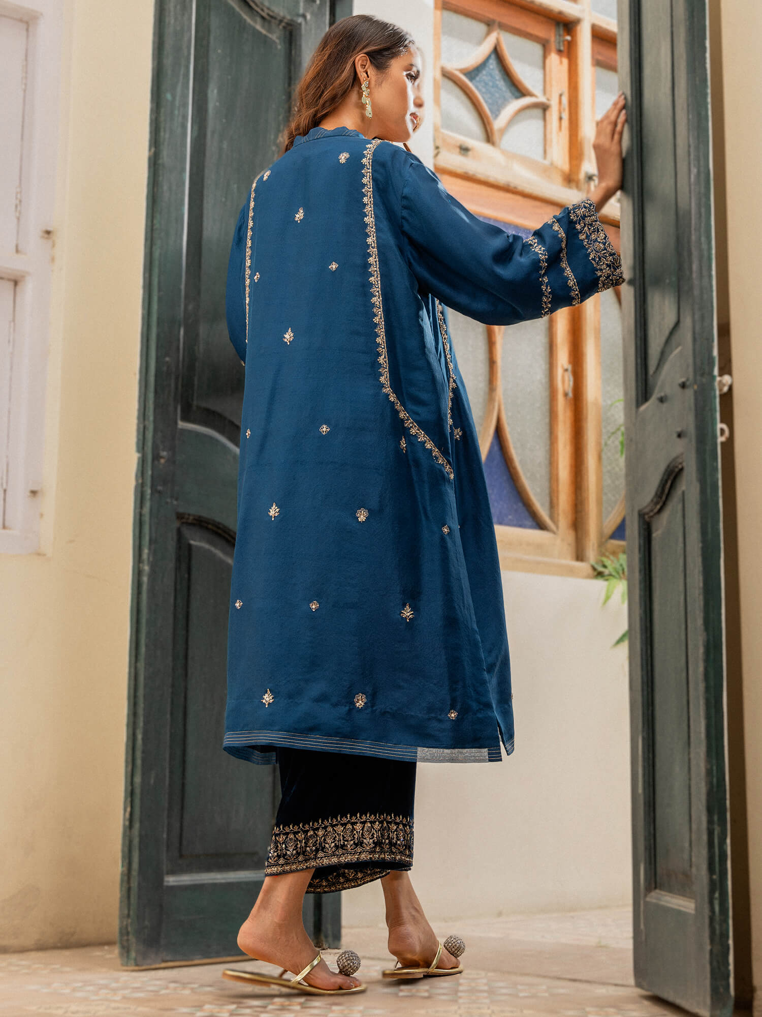 Crafted from teal blue khaddi silk, this Keenu kurta is elegantly embroidered with resham embroidery and jeweled work, inspired by Mughal florals. It is paired with a matching crafted velvet izaar, creating a timeless ensemble for any festive occasion.