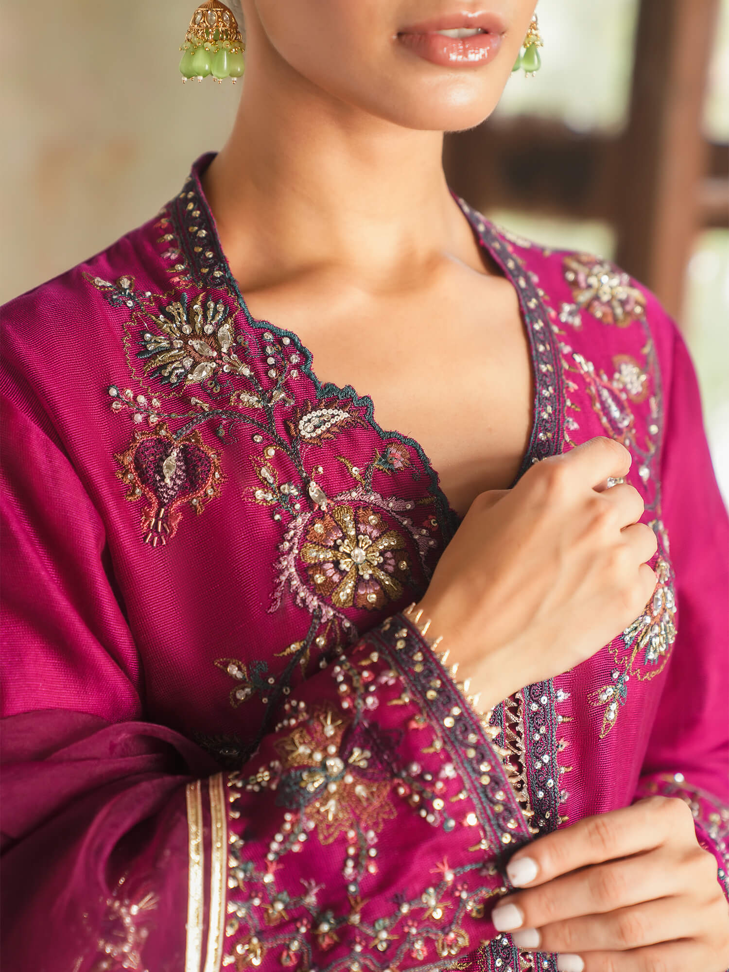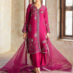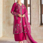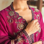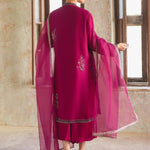 Our magenta Ziggy Kurta is adorned with multi-hued resham embroidery inspired by chintz florals coupled with hand touching, adding to its allure. Crafted from spun net, it is a must-have piece for this festive season. It is paired with matching culottes and a lightly embellished dupatta for an effortless look.