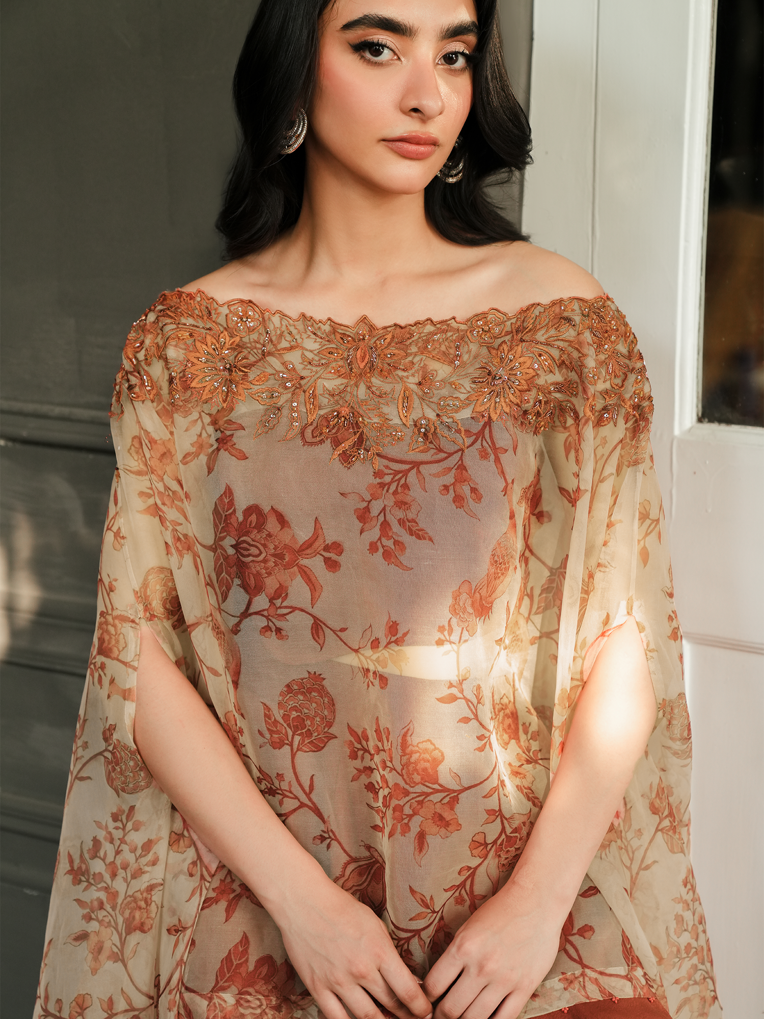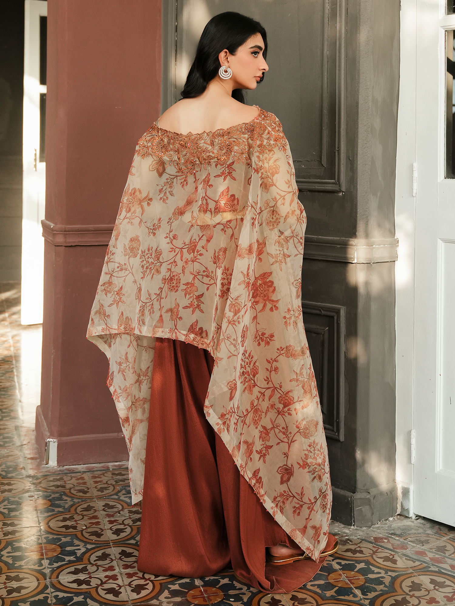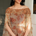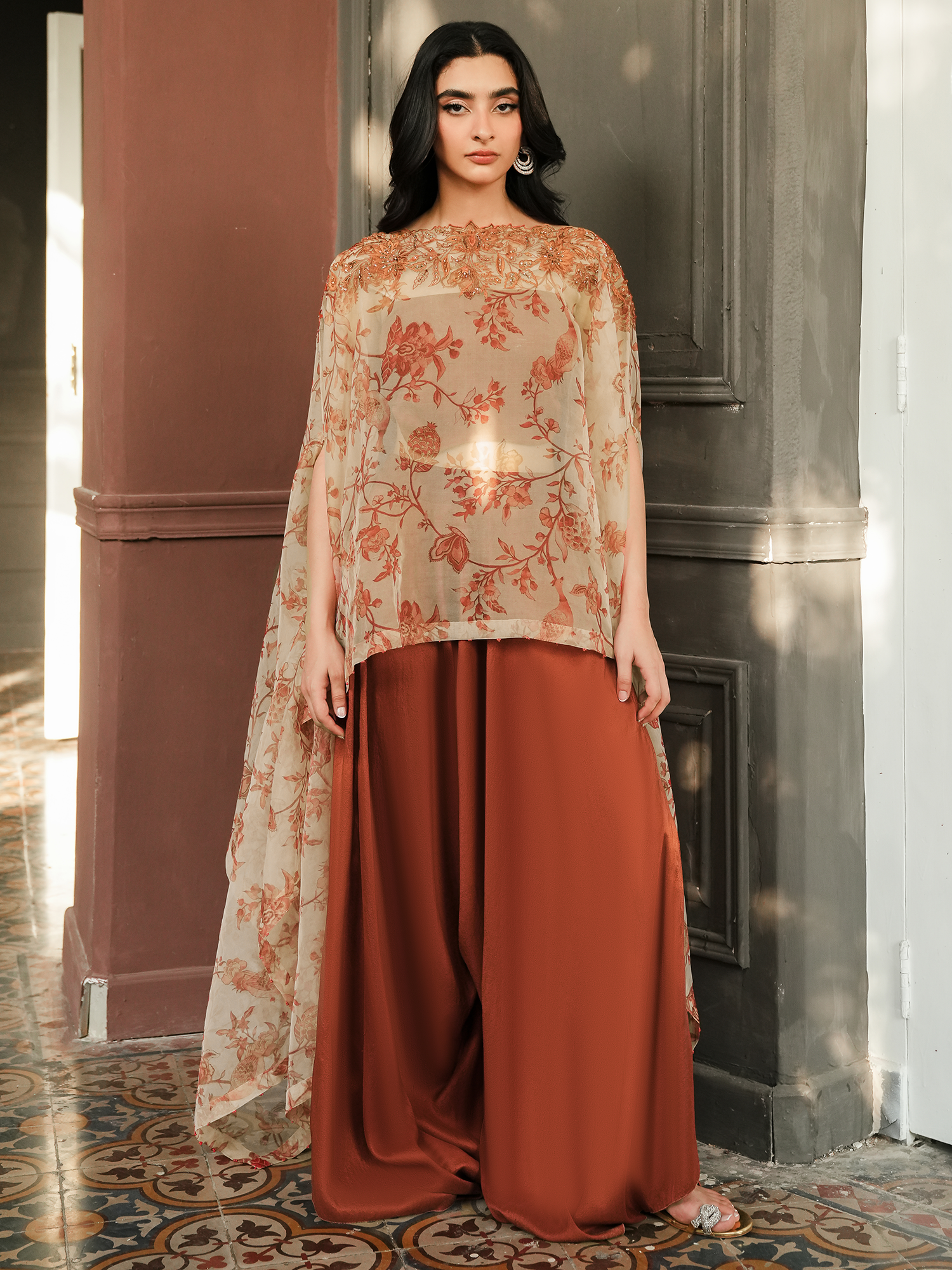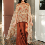 Crafted from organza, the Inca poncho's timeless design ensures a flattering fit every time. It boasts an all over print on ivory in brick red hues, showcasing chintz florals motifs. It is further accentuated with resham work on the neckline, paired with free flowing pants for an effortless look.