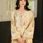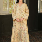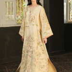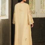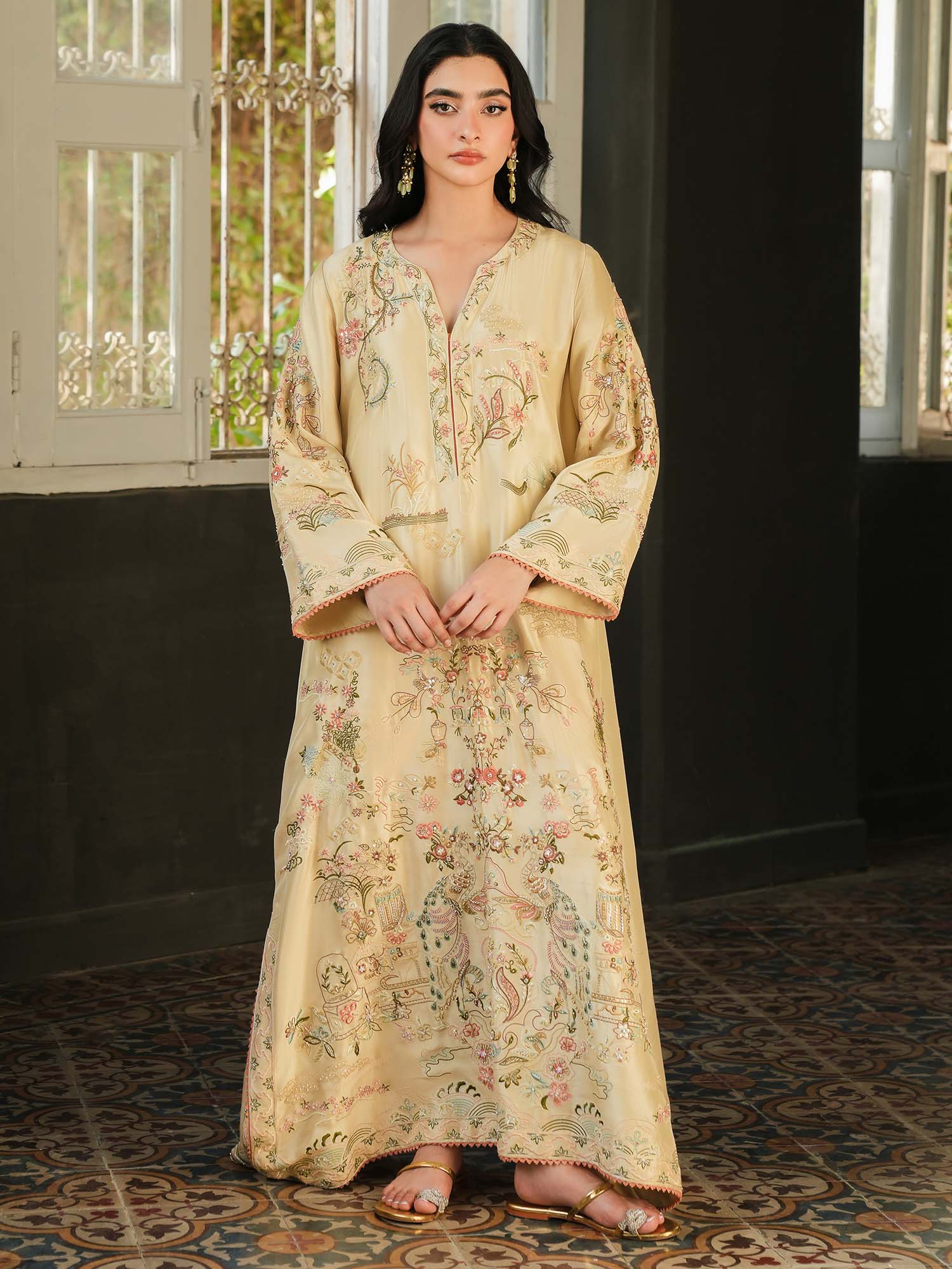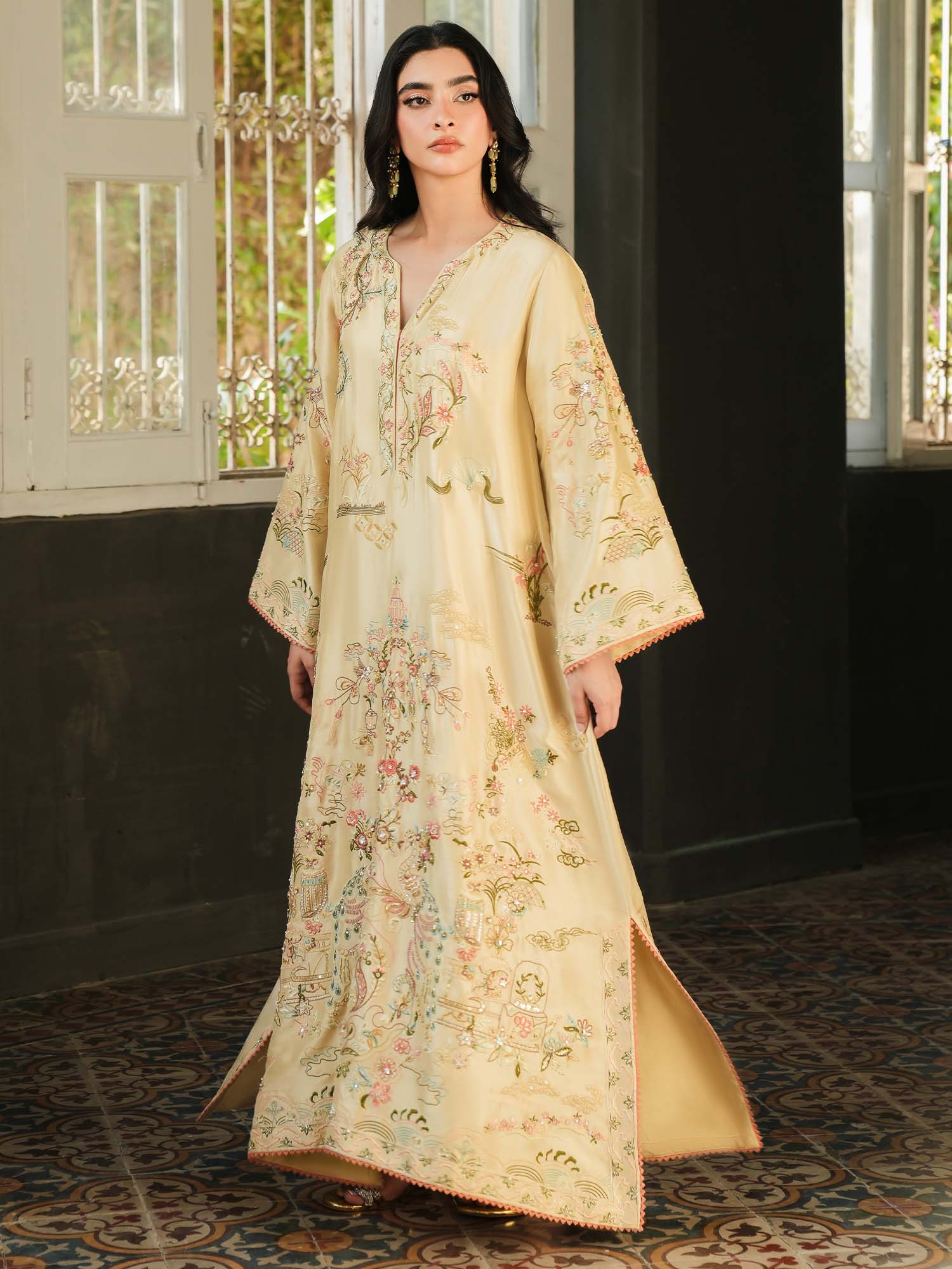 Stand out this festive season in our pale yellow raw silk Jalabiya. It features fine multi hued resham embroidery with zardozi work inspired by Japanese florals. A timeless ensemble for any festive occasion.