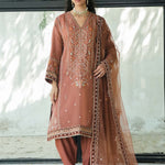 The Nimr is crafted from chestnut rust organza and showcases fine craftsmanship featuring multi resham embroidery with zardozi work inspired by Mughal floral motifs. It is paired with a matching skinny shalwar and a beautifully embroidered organza dupatta.