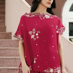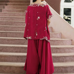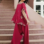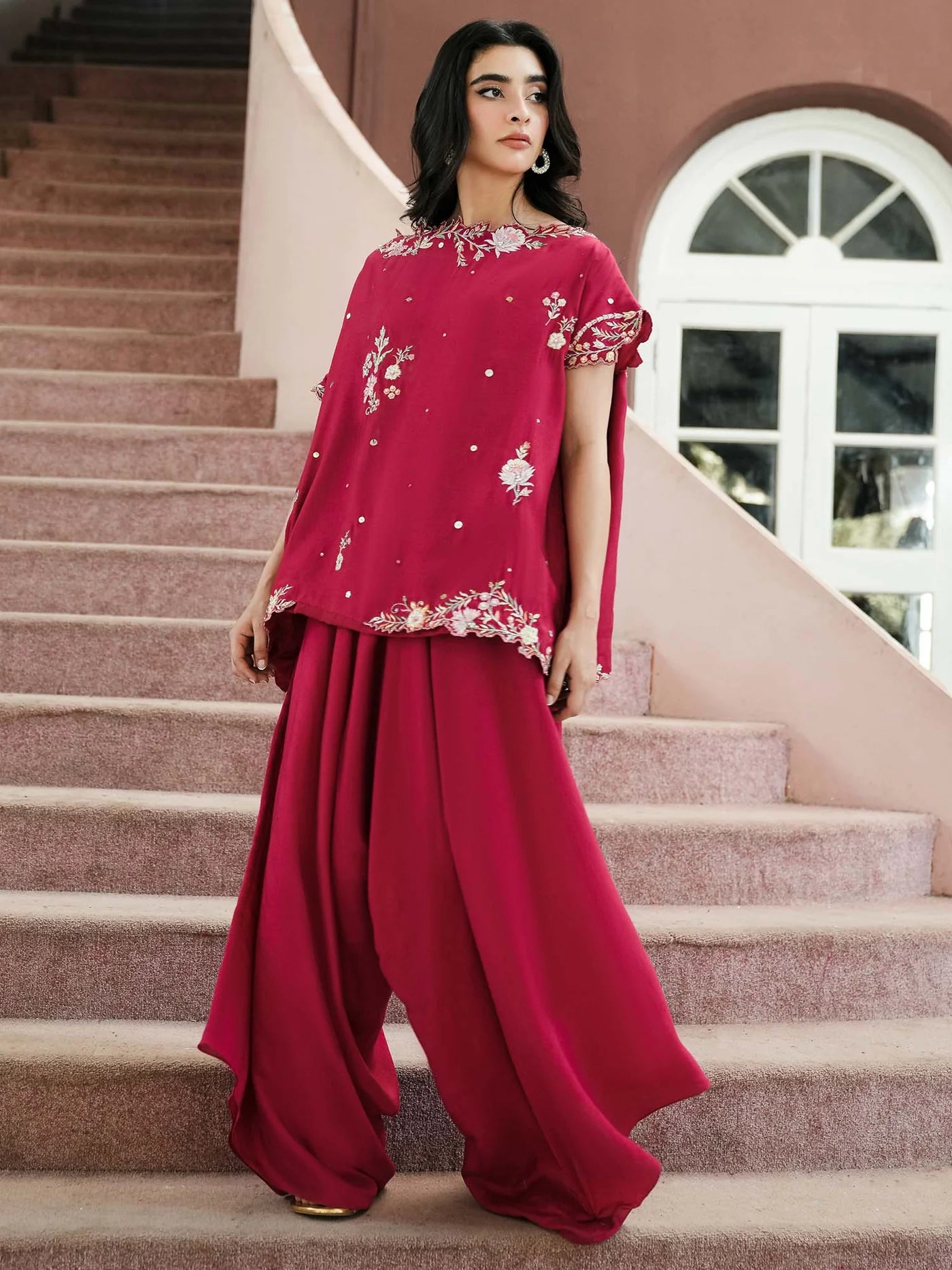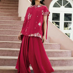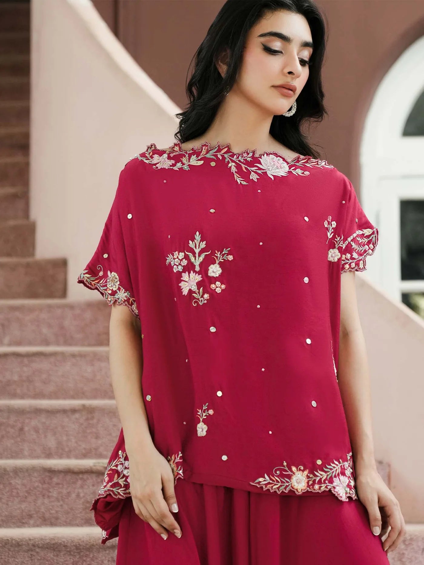 Ideal for an evening edit; whether you're going to a soirée or a wedding. This versatile piece can be styled as one shoulder or an off-shoulder and features multi hued resham and zardozi work inspired by Mughal and French florals motifs. Paired with matching free flowing pants for a flattering look this season.
