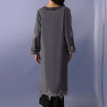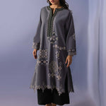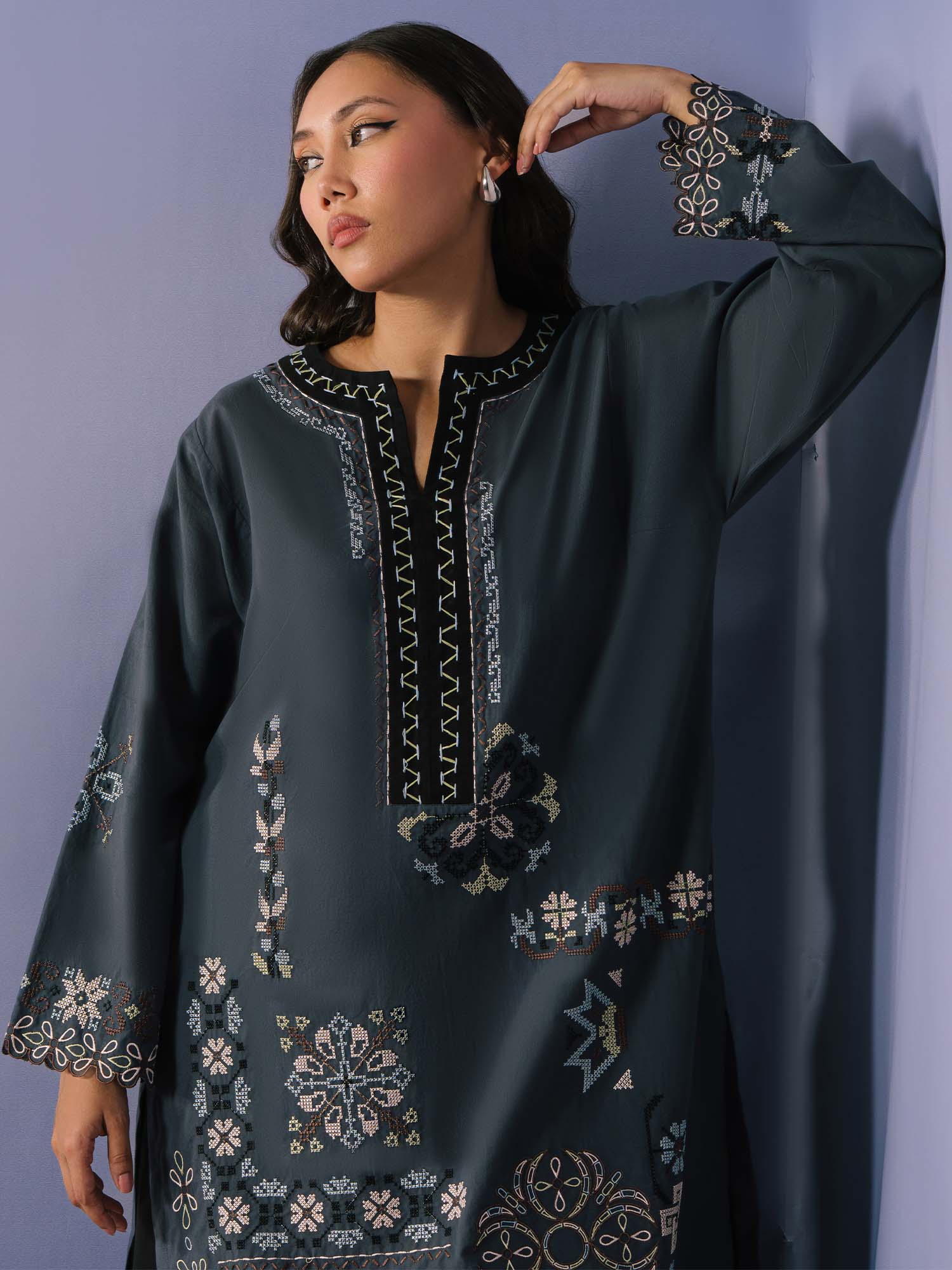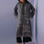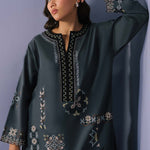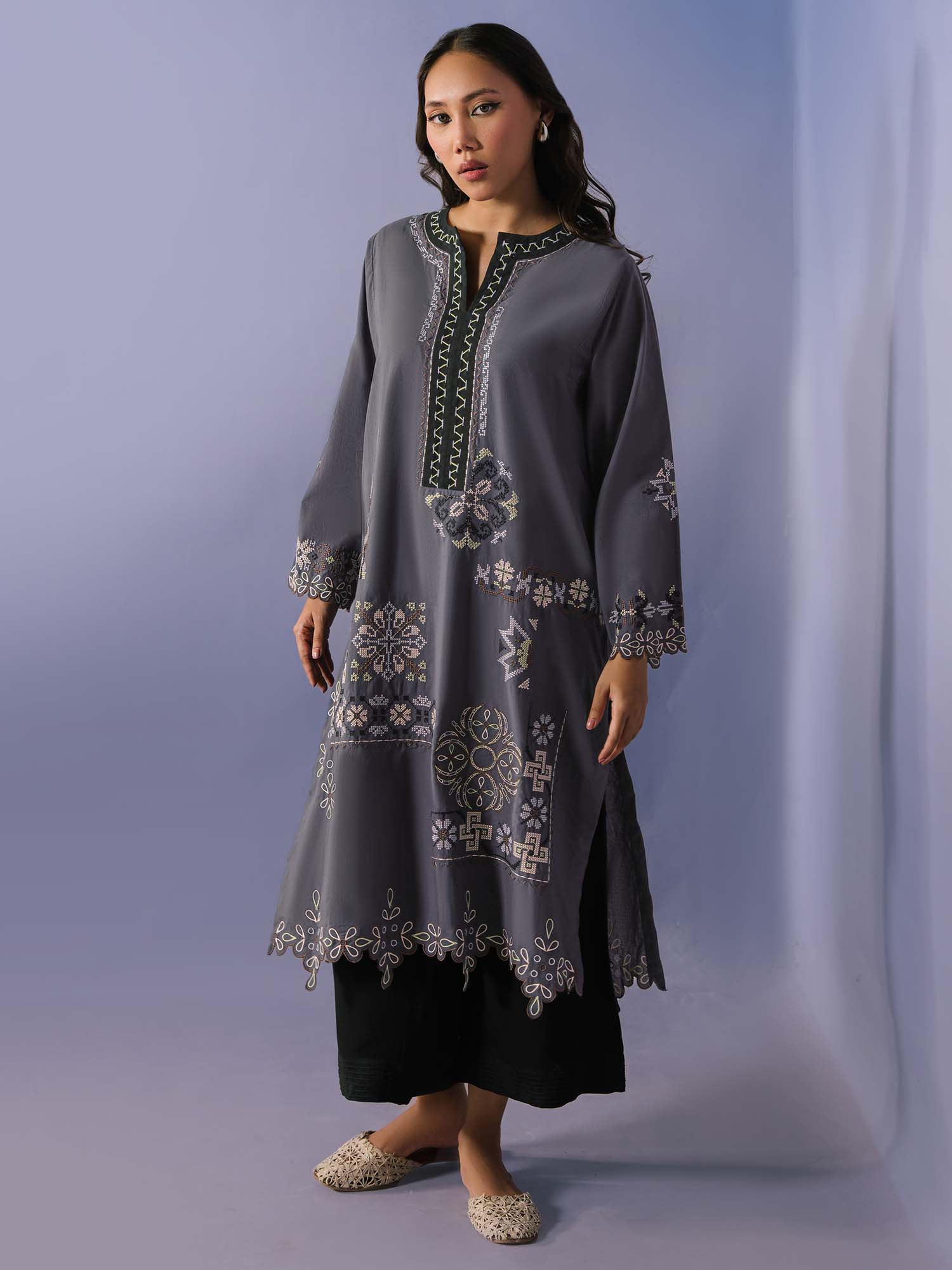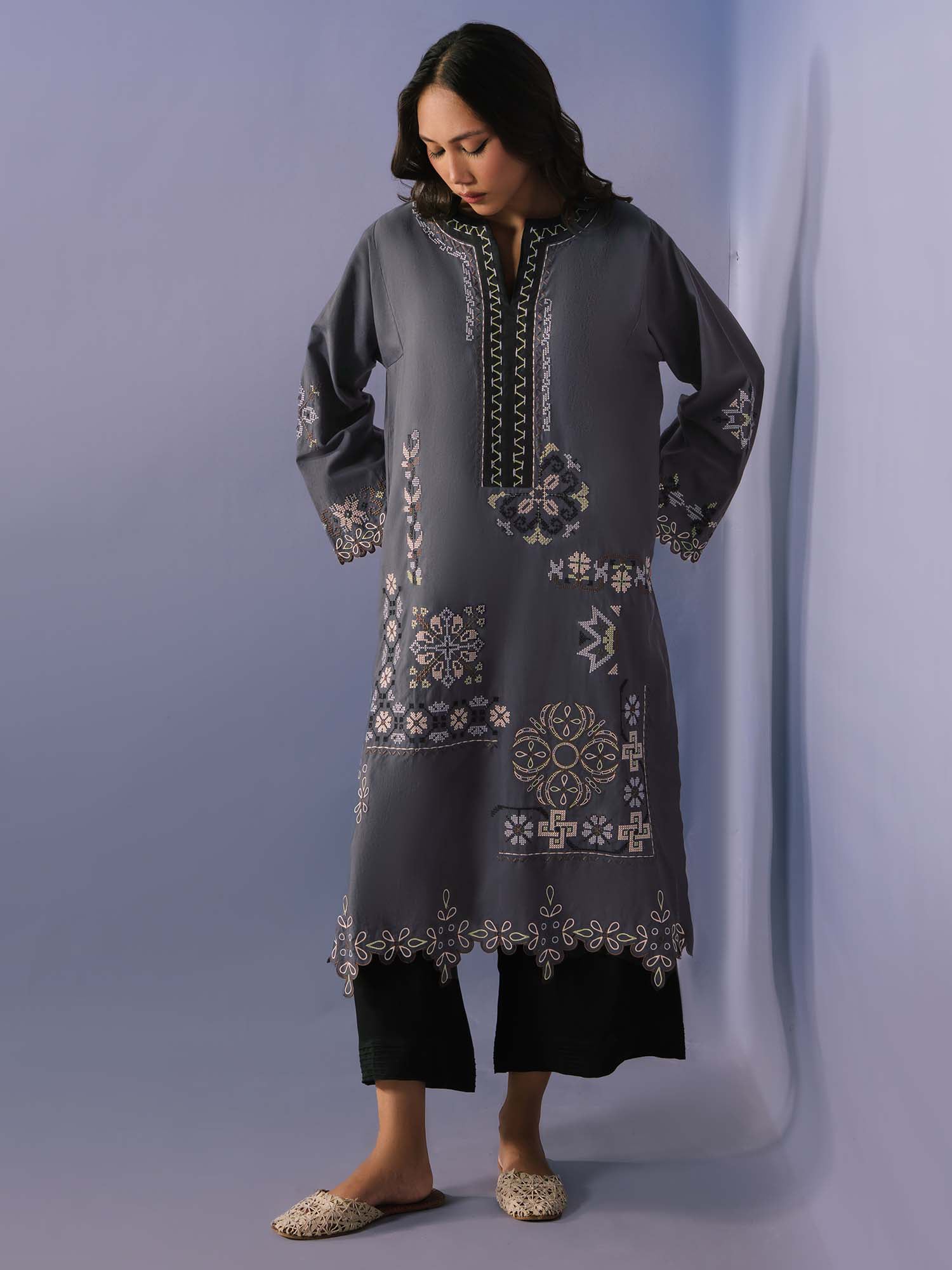 Crafted from cotton, this deep blue Raya kurta features fine cross stitch embroidery with cutwork inspired by floral and geometric motifs. Style it with our black izaar, as seen here.