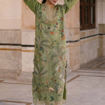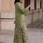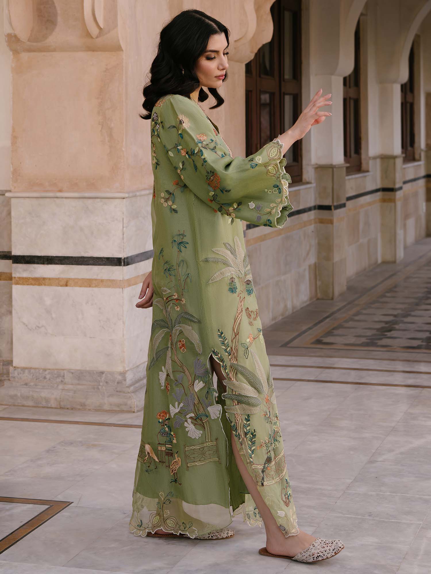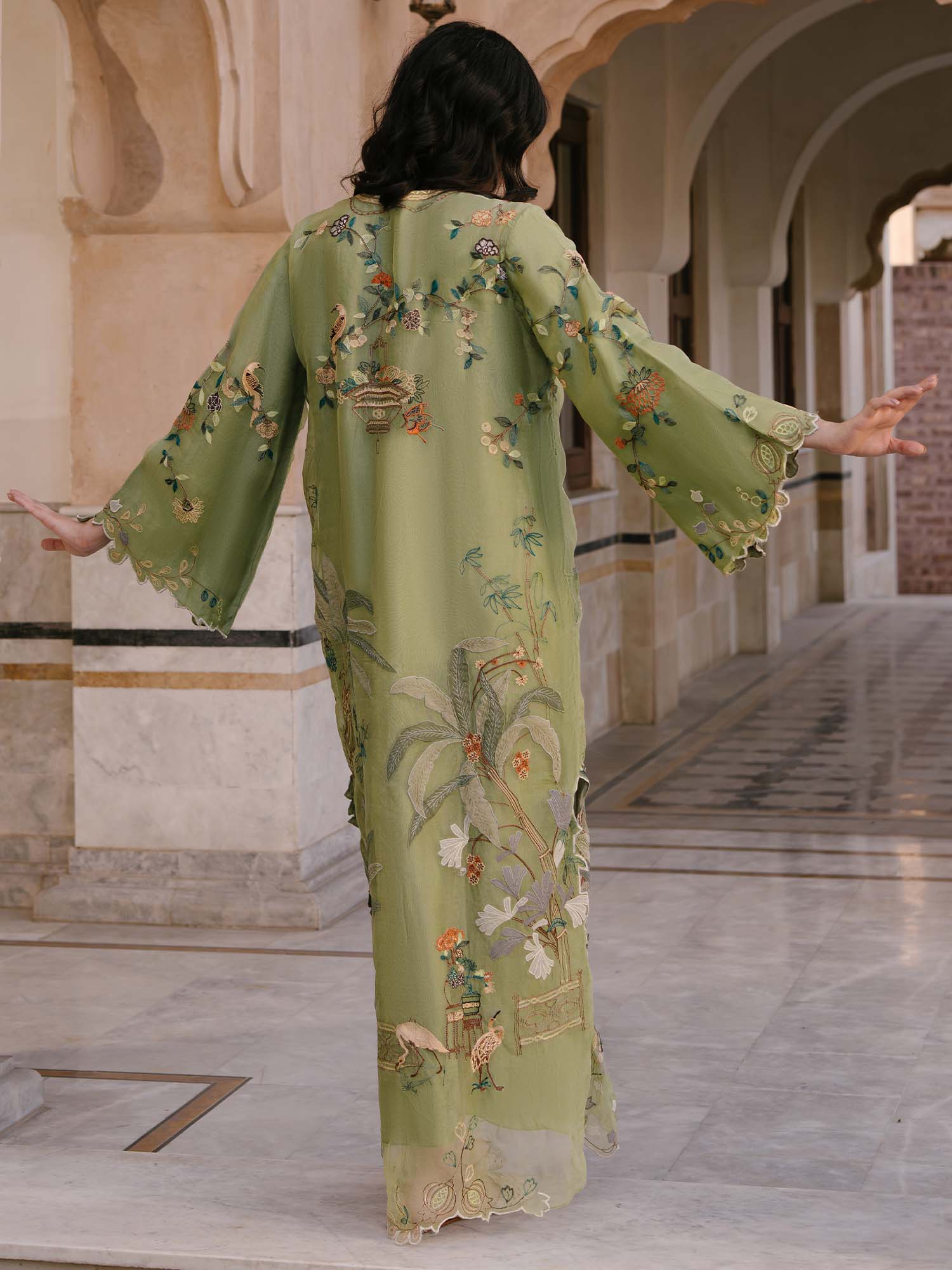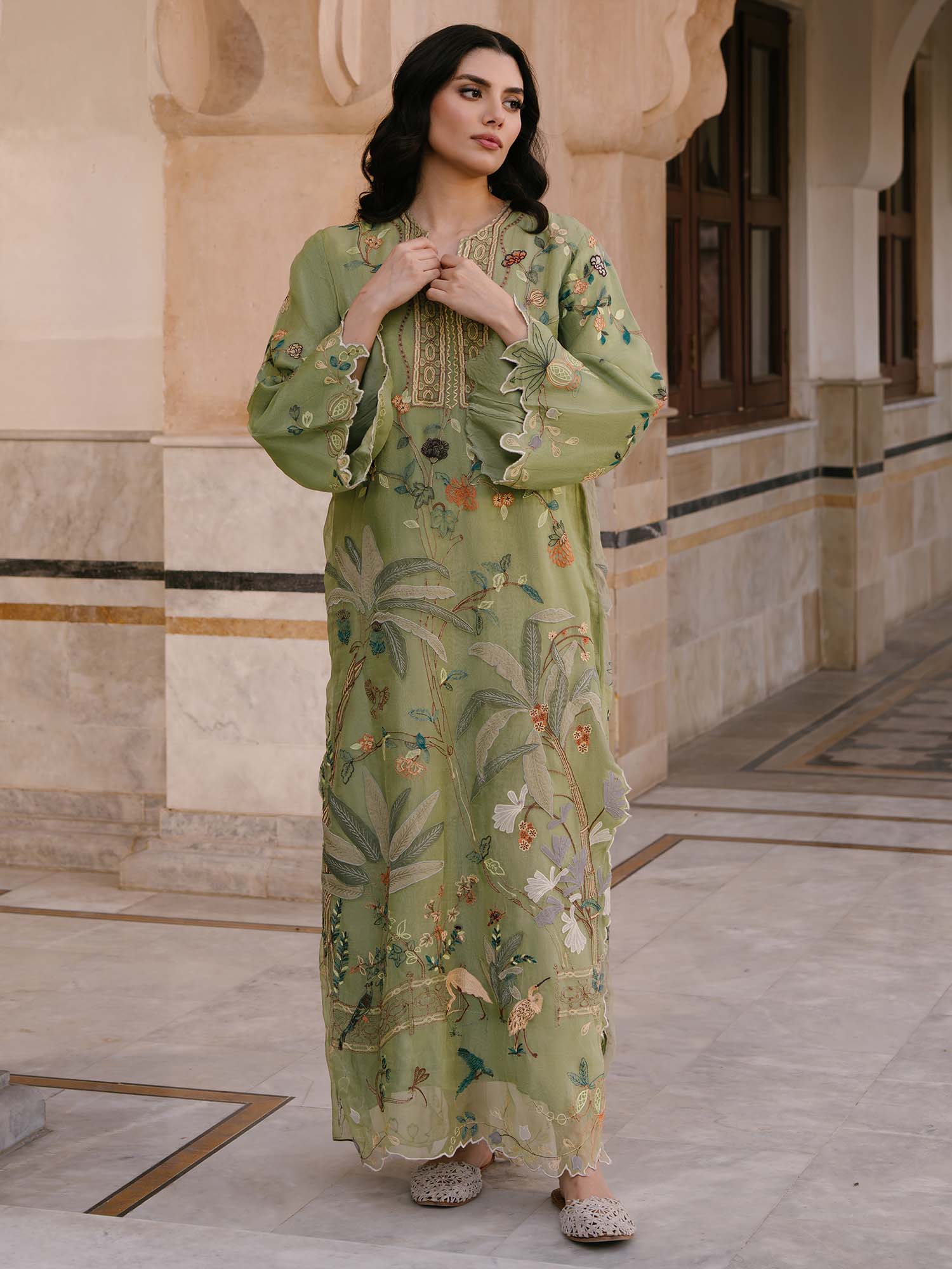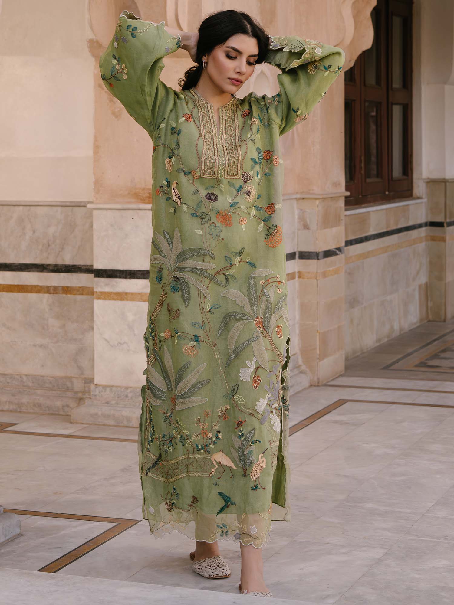 Our pale pistachio Savannah is an elevated essential for this season. It features fine aari work coupled with applique in coral, ecru, and green hues inspired by chinoiserie motifs. It is further elevated with cutwork detailings. It can easily be dressed up or down for all your summer dalliances.
