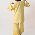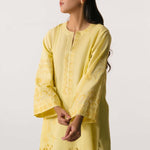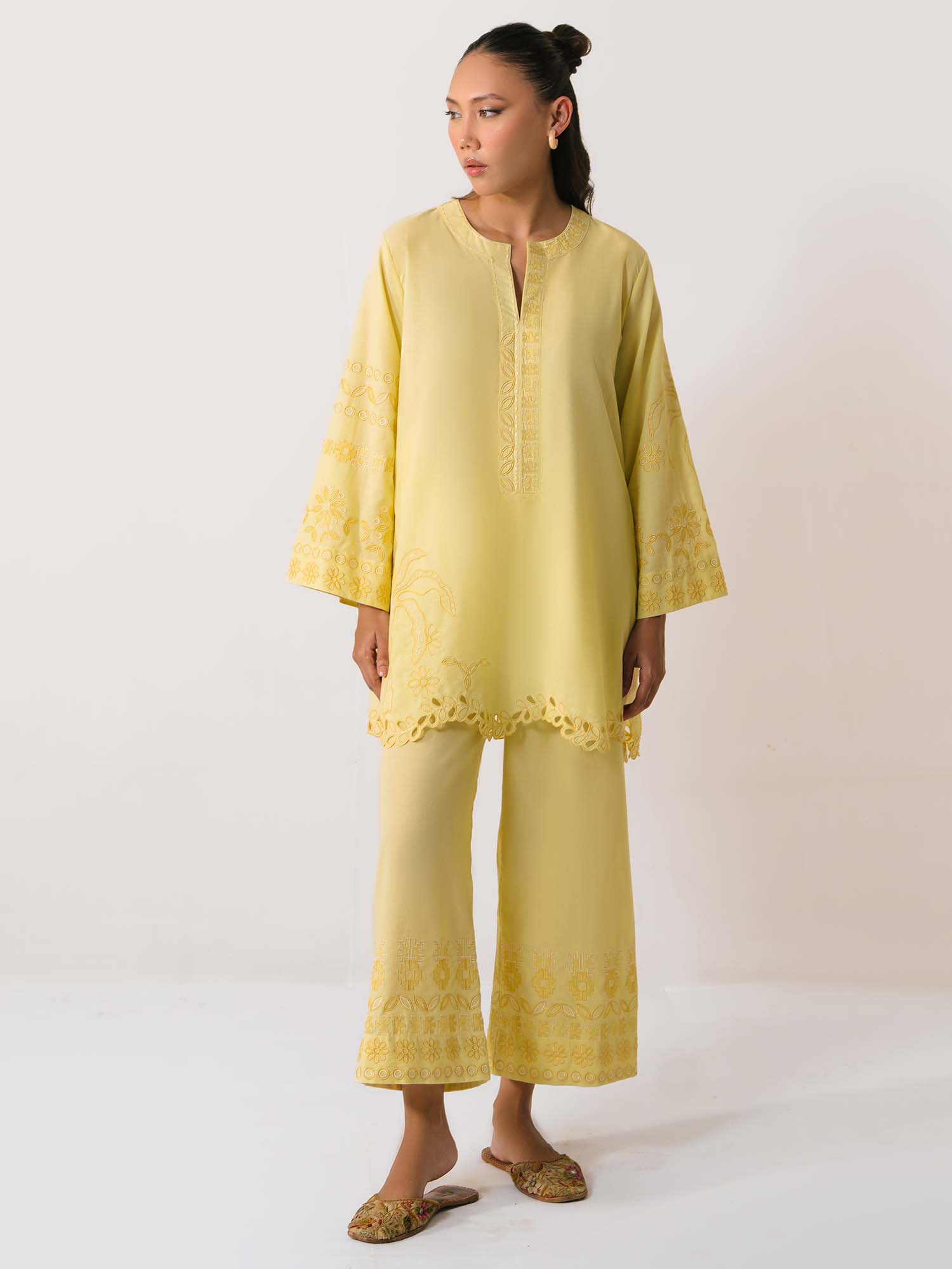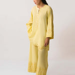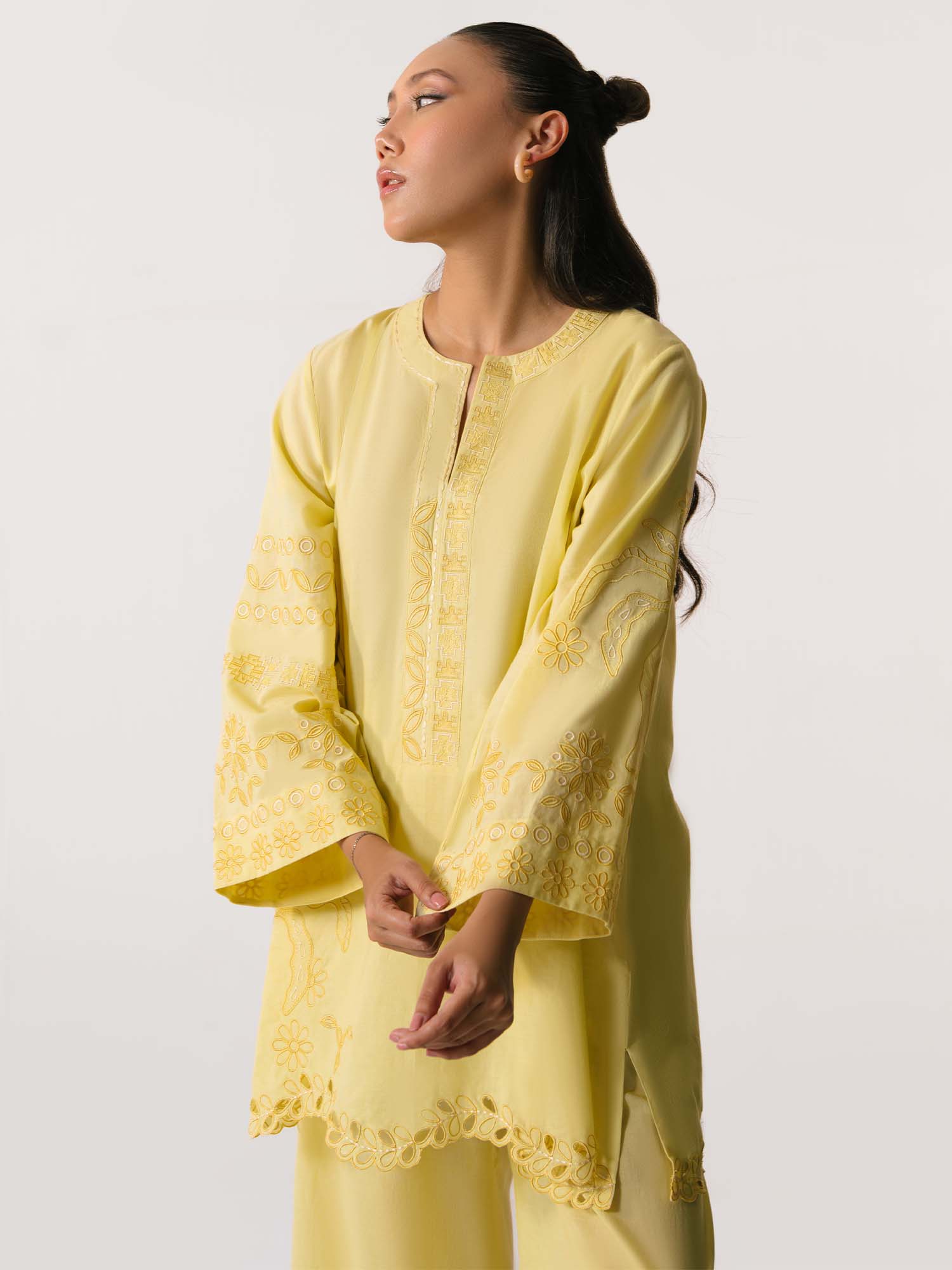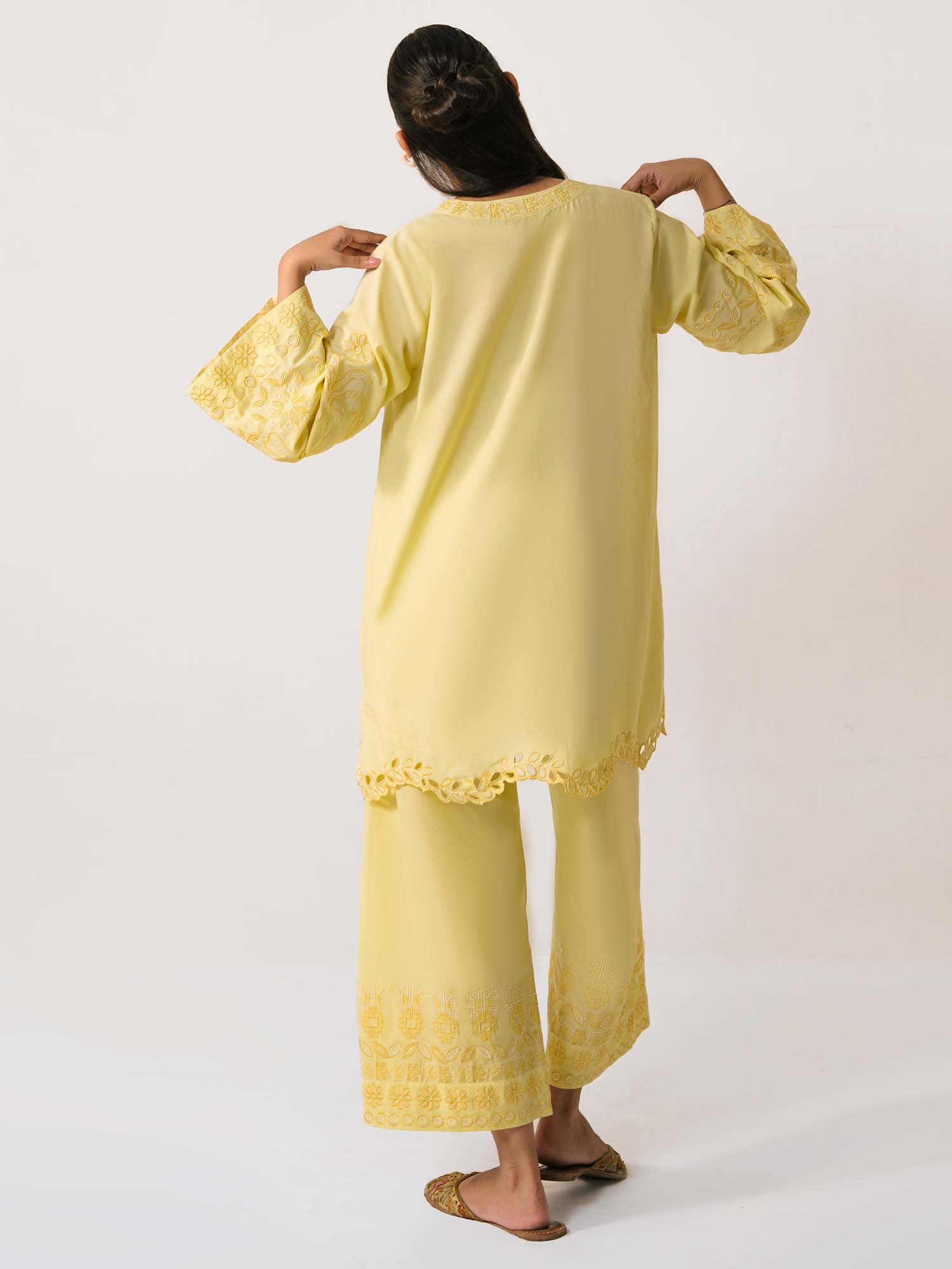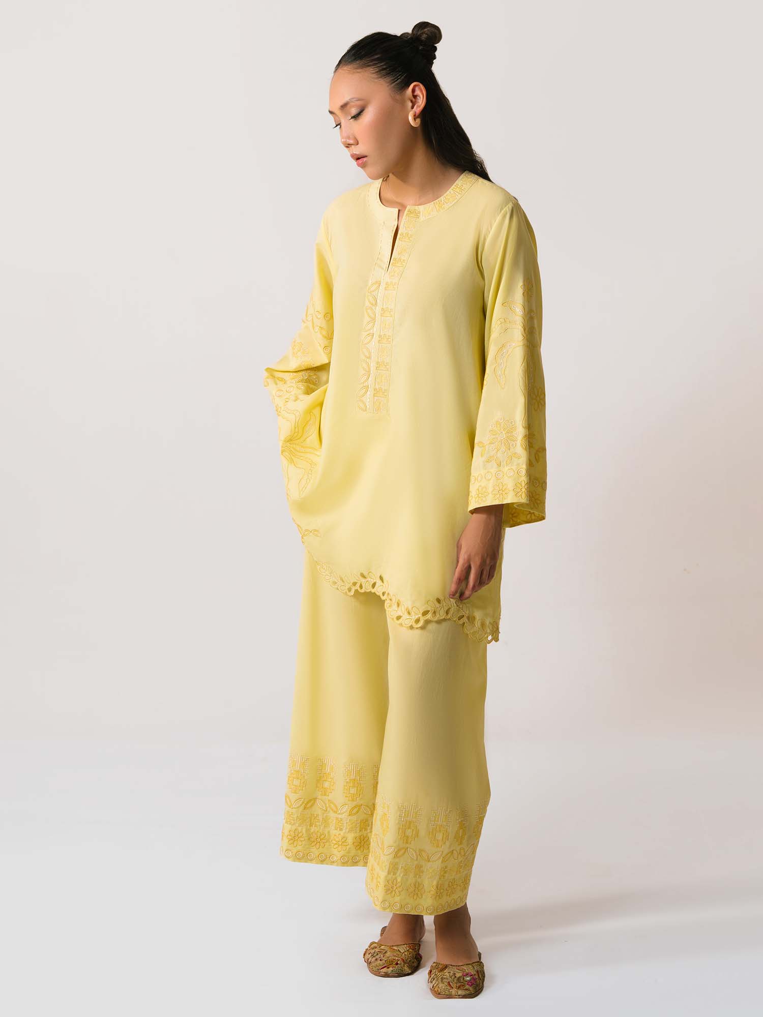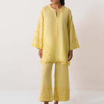 The butter yellow short Sicily will bring a sense of modern, effortless elegance to your wardrobe. This head-turning ensemble features tonal embroidery with cutwork inspired by florals and palm tree motifs. It is paired with our matching crafted izaar for an elevated look.