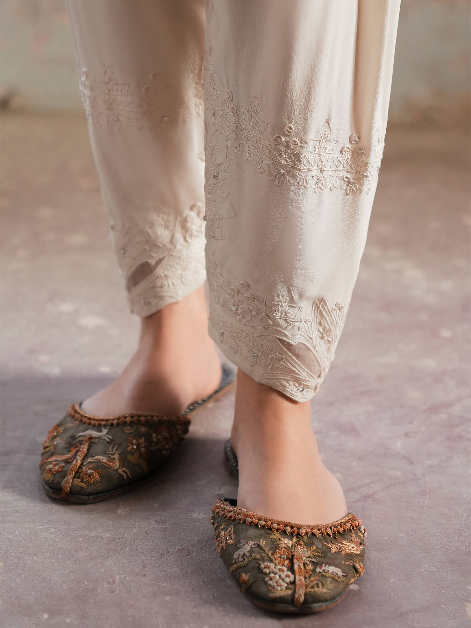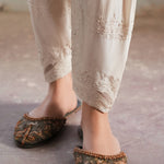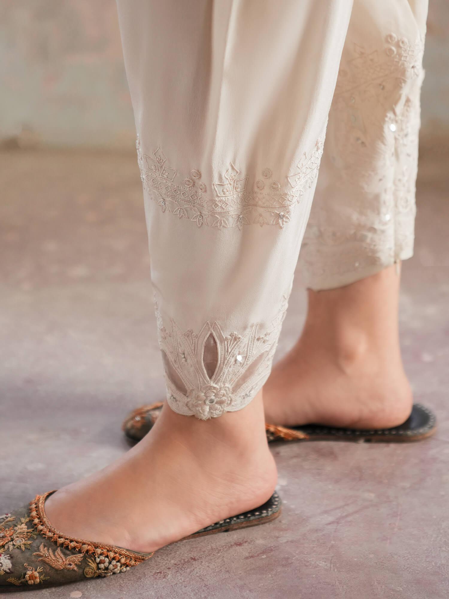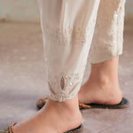Our skinny shalwar is made from a lightly structured crepe that will hold its shape even after hours of wear. It features fine ivory embroidery with reverse appliques, adding instant charm to any kurta you pair it with.